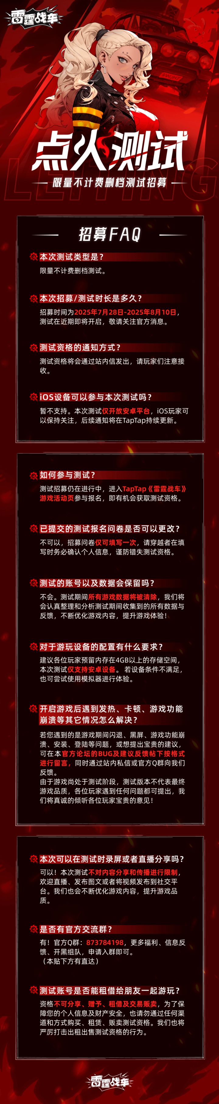 亲爱的穿越者:《雷霆战车》首次限量删档测试在近期即将开启!初次与大家相见,体验或有不足,但您的每份反馈我们都将视若珍宝!斑斑已经十分期待与大家的相遇啦~为了各位穿越者顺利抵达塞姆比奥斯,斑斑为大家准备了一份测试常见问题合集,请穿越者接收查阅哦~ o(* ̄▽ ̄*)ブ点火测试有奖招募仍在进行中! 即刻前往 TapTap《雷霆战车》活动页报名,即有机会参与哦~💌 官方社区:QQ群(唠嗑、解惑