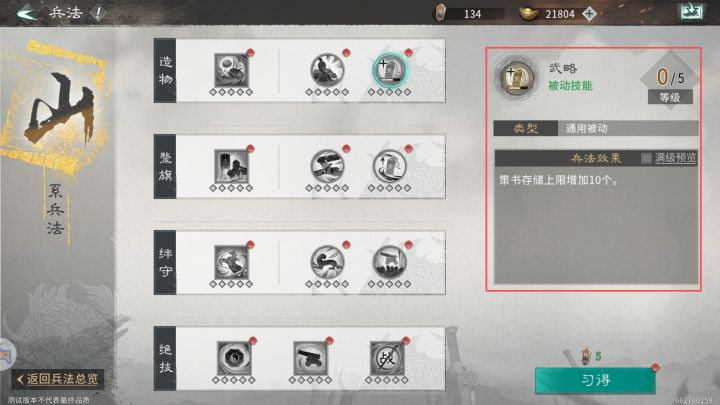 投稿人:寰宇丨吕奉先 今天为大家带来三国天下归心的兵法攻略,为大家介绍四种兵法的加点及推荐。小技巧:游戏下线前把策书上限点满,离线后能够恢复更多的策书,再次上线时再把技能点重置,即使策书超出上限也不会减少。 一.山系兵法 第一行:主动技能效果为包子制造,被动技能效果为减少包子消耗和提高策书上限,根据自己的包子消耗自行选择,包子多可以选择不点【丰俭】(使用包子有概率不消耗)。 第二行:主