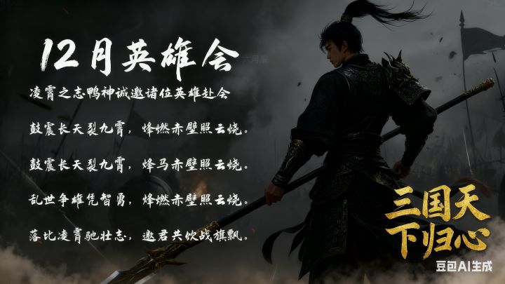 盖闻天下大势,分久必合,合久必分。今群雄逐鹿,烽烟四起,正是豪杰建功立业、共谋大业之秋!吾辈结盟聚义,非为一己之私,实欲扶危济困、共创盛世,仿刘关张桃园结义之赤诚,效诸葛孔明鞠躬尽瘁之忠勇。 现广纳天下贤才: - 有万夫不当之勇,可斩将夺旗者,为吾辈之猛将,共破阵杀敌; - 有运筹帷幄之智,能审时度势者,为吾辈之谋臣,共定安邦之策; - 有赤诚之心,愿同舟共济者,为吾辈之手