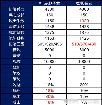 两位三国战神——赵子龙与吕布,谁才是乱世最强主将?本期带你从属性、兵种天赋、资源消耗到实战表现,全面对比他们的强度差异,助你选择最适合自己的主力武将!🏹🧩武将对比初始属性对比如图所示,神话·赵子龙的初始抵挡、暴击和反击率高于魔魇·吕布,而三围和攻击系数明显低于魔魇·吕布;暴击率和反击率这些其实影响不大,都是可以通过其他方式来叠到100%的。兵种、战法天赋对比神话·赵子龙的特点主要在于: