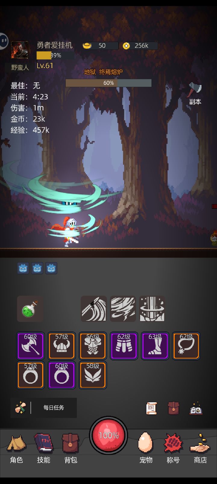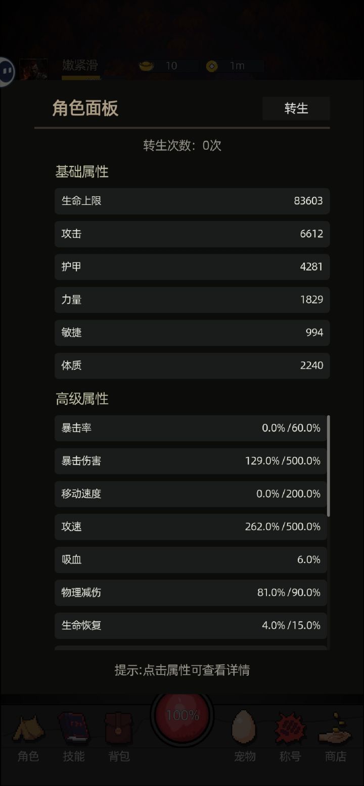 挂了三个星期了,想看个东西经常点来点去看不方便,整合一下数据清晰些。还有更新后只能打相应等级的转生副本,打相应的一轮25波需要8分钟套装装备爆率也太低了,而且越更新越打不动扛不住。我手机亮屏低亮度挂了三天才出一件套装。打不过然后又去打的宠物,存的门票刷的都是白色居多。强化石上限看完广告才250个,能不要上限,随机出强化石吗,宝石强化成功率也极低。强化也上不去,宝石也上不去,宠物也不咋地,然后