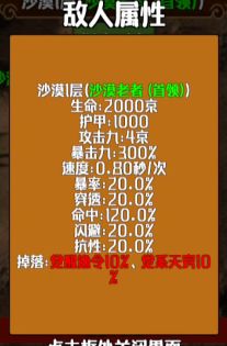 其他问题点击下方链接跳转每个人的面板不同,只描述大概的攻击需要沙漠老者 攻速慢,很好闪避。面板属性:攻击力60兆,120暴击率,100闪避。攻击力够带手套,攻击力不够带武器。掉落:自动觉醒,觉系天赋风暴龙攻速慢,很好闪避,比沙漠老者难一些。面板属性:攻击力80-100兆,120暴击率,100闪避+1手套掉落:觉醒战印,神技石
