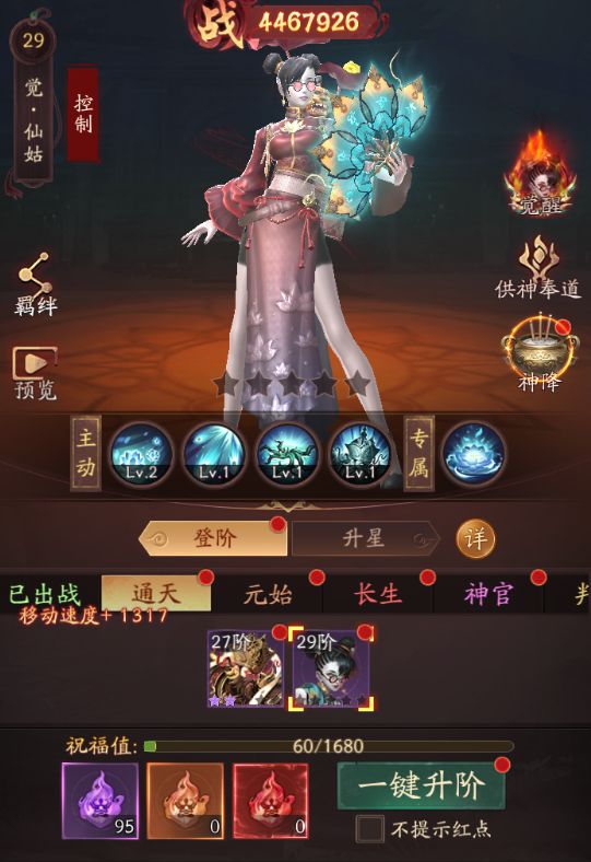 1.神君一:通天-元始-长生-神官-判世-战魂(6个阶级)通天:新人能白嫖2只通天级别神君:持国天王/仙姑第一天拿到手,直接全力升持国天王:高额AOE伤害,秒杀小怪机制,前期推本很好用。 元始:也能活动礼包白嫖,比较好用的火神祝融和水神共工,一输出一奶,配合着用来过度,非常丝滑 长生:有点一两百预算得可以整个猪八戒(98米,拿1只猪八戒,还有一堆稀有材料,性价比很高),猪八戒是版本前中期
