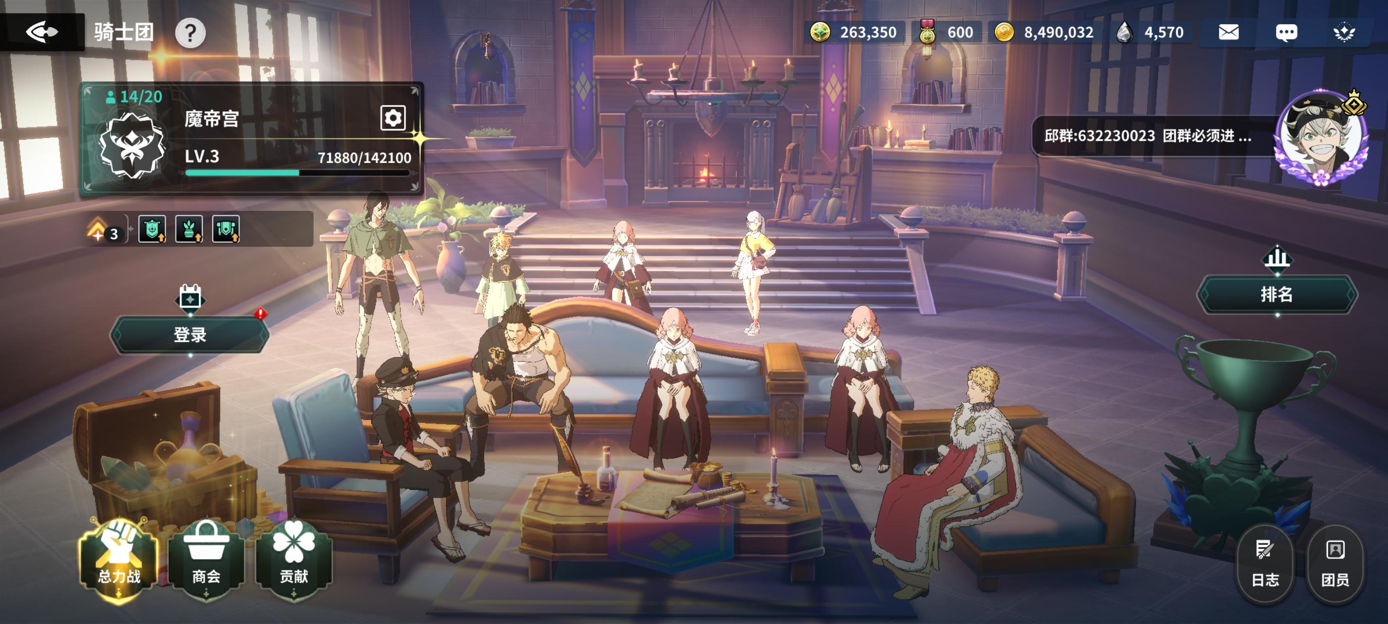 三级骑士团魔帝宫招人啦进团需知:1、本团是休闲团,但是每日活跃任务必须做(有事可以和我说一下)2、捐献每天至少金币5次+黑水晶1次(为了 跟上进度迫不得已呀)3、 活动任务尽量参加,每天我会在群里提醒qq群:632230023#黑色四叶草魔法帝之道