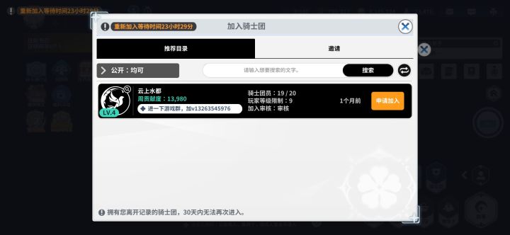 组织活动有三个,首领战,荣誉战,竞技场,我在保证首领战次数用完,竞技场票一直打不回满且荣誉战所有箱子全领的情况下被踢了,说我荣誉战分数低,那我个人理解是箱子都领了且骑士团赢了就行了呗?即便是我对规则不熟悉的情况下确实分数低了,那你可以私聊我告知一下不行?二话不说直接连群带游戏一脚踢了,24小时不能进团外加错过一整轮活动。