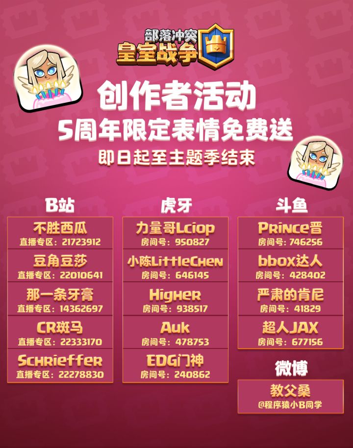 春眠不觉晓,5周年限定表情怎能少?!点击指南,获取免费限定表情,加入这场皇室庆生季狂欢!【途径一:5周年限定表情千人锦标赛】活动期间,4个平台的15位内容创作者们(详情请见配图)将会通过开启千人锦标赛的方式,为大家送出5周年限定表情!锦标赛开启的具体时间和锦标赛标签等请关注各位内容创作者动态!【途径二:互动赢取限定表情】除参与千人锦标赛活动以外,参与上述15位内容创作者及评论区8位内容创