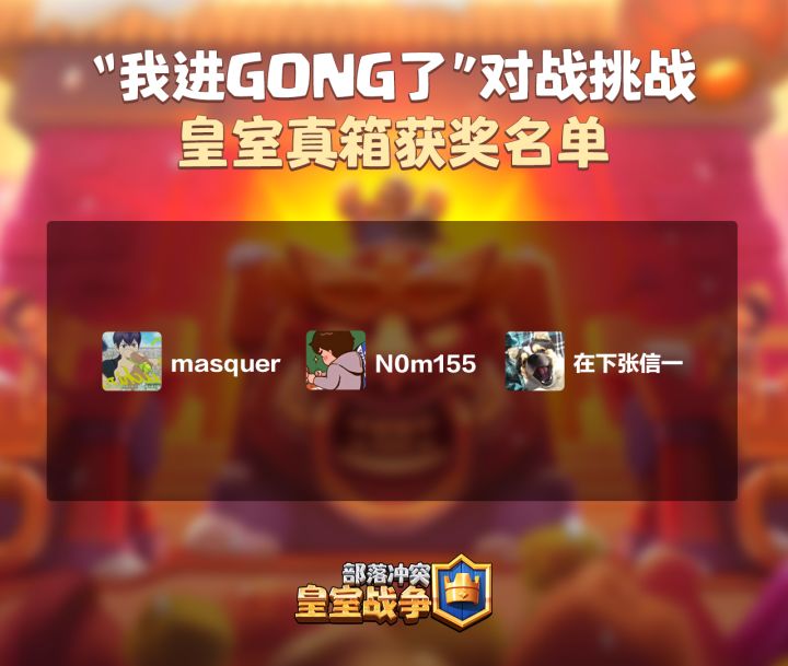 亲爱的挑战者们:新年快乐,感谢你们对的热爱与支持!感谢你们的积极参与,以下是 2 月 6 日的《3个皇室真箱+年份皇室令牌奖励来了!冲呀!》活动中奖名单,赶快来看看你有没有中奖吧!● 原帖地址:● 领奖日期即日起至 2 月 28 日● 领奖方式请获奖的玩家在本帖下方回复你 QQ 号后 4 位,并添加活动群:897530693,联系群管理“奥格瑞玛步兵”进行领奖● 领奖凭证请私聊群