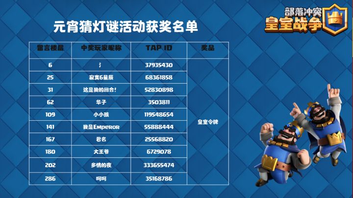 亲爱的挑战者们,感谢你们对的热爱与支持!以下是 2 月 26 日的《皇室共闹元宵,猜灯谜赢好礼!》活动中奖名单,赶快来看看你有没有中奖吧!●灯谜谜底:【渔夫】【哥布林】/【哥布林团伙】【公主】【蝴蝶】【狂暴樵夫&复仇滚木】【王子】* 由于各位挑战者对于第二个谜面有些不同的意见,故【哥布林】和【哥布林团伙】两个都可计入并获得抽奖的机会。● 原帖地址:● 领奖日期即日起至 3