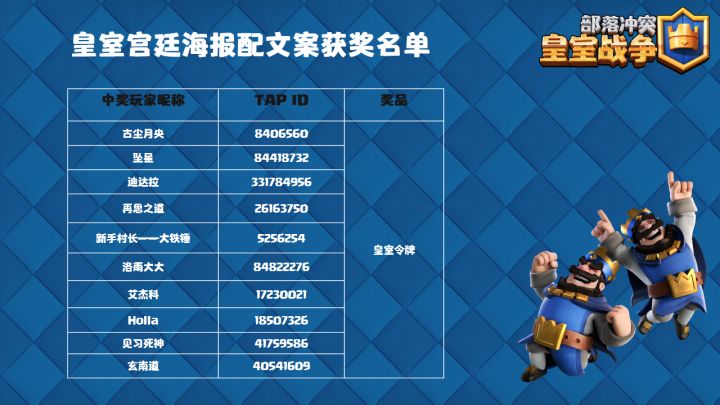 亲爱的挑战者们,感谢你们对的热爱与支持!以下是 1 月 15日的《为皇室宫廷海报配文案,转发可赢取皇室令牌!》活动中奖名单,赶快来看看你有没有中奖吧!● 原帖地址:● 领奖日期即日起至 2 月 16 日● 领奖方式请获奖的玩家在本帖下方回复你 QQ 号后 4 位,并添加活动群:897530693,联系群管理“奥格瑞玛步兵”进行领奖● 领奖凭证请私聊群管理,给出你的留言楼层与 Tap