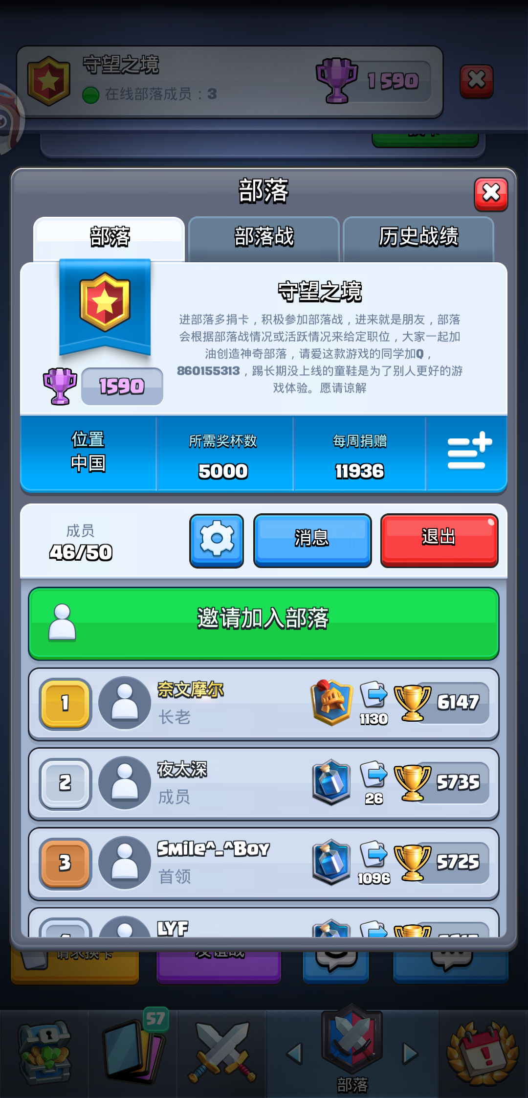 各位,我们部落部落战越打越好,明显进步,每周部落战第1,保拿传奇卡,这次部落战再次破记录,只用了2天完成任务,本部落:黑暗之殿,目前49人,招活跃部落战玩家,且久驻。有意者联系我微信:jp10102007