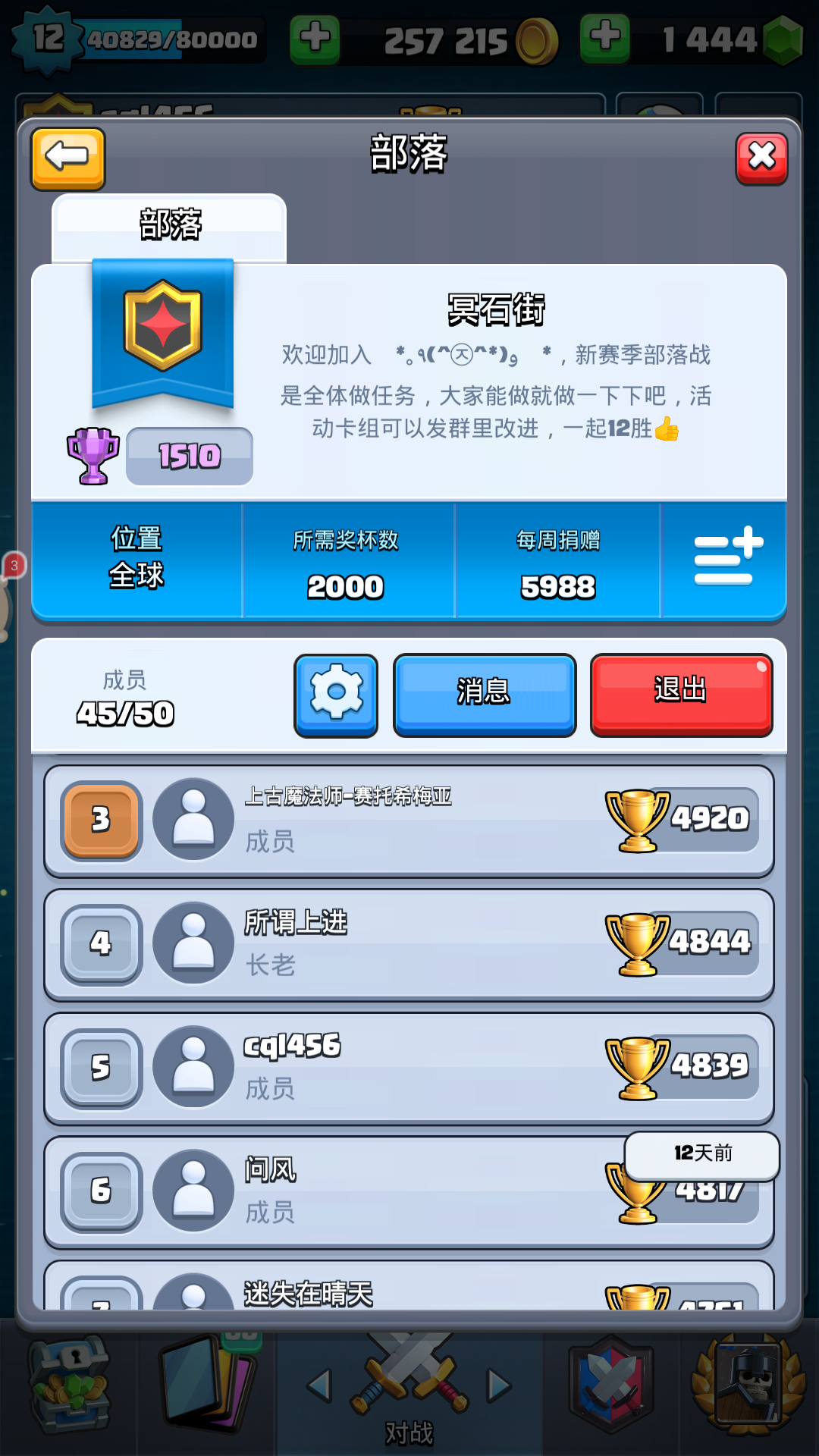 部落名称: E=mc2部落名称:弥生月十入会要求:4000 ,塔等不要紧,只要你能胜率4-0,卡等低点无所谓,我们给你捐,周一周二冲刺,过线休息,打2休4 公会简介:弥生和EMC为友盟部落,两边的人会互相帮忙打船,换卡,1v1交流,互相走动,气氛和谐,都跟活跃,团结才能走更远,两个部落均领跑河道第一3周以上了,你只要活跃打部落战,可以零捐我们给你捐,有专门修船工具人,本周招募两人,来了包分配,