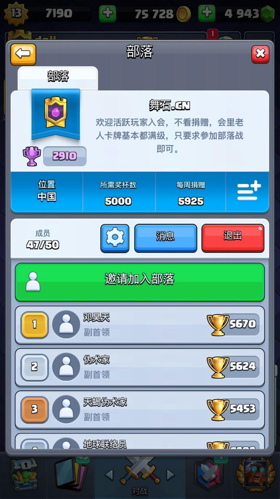 部落名称:舞石.cn部落标签:#GQLYGU招部落战活跃玩家,目前30多人活跃,随便来几个每周稳稳的拿第一。目前要求分数5000,如果不够也可加我微信bit999999沟通。
