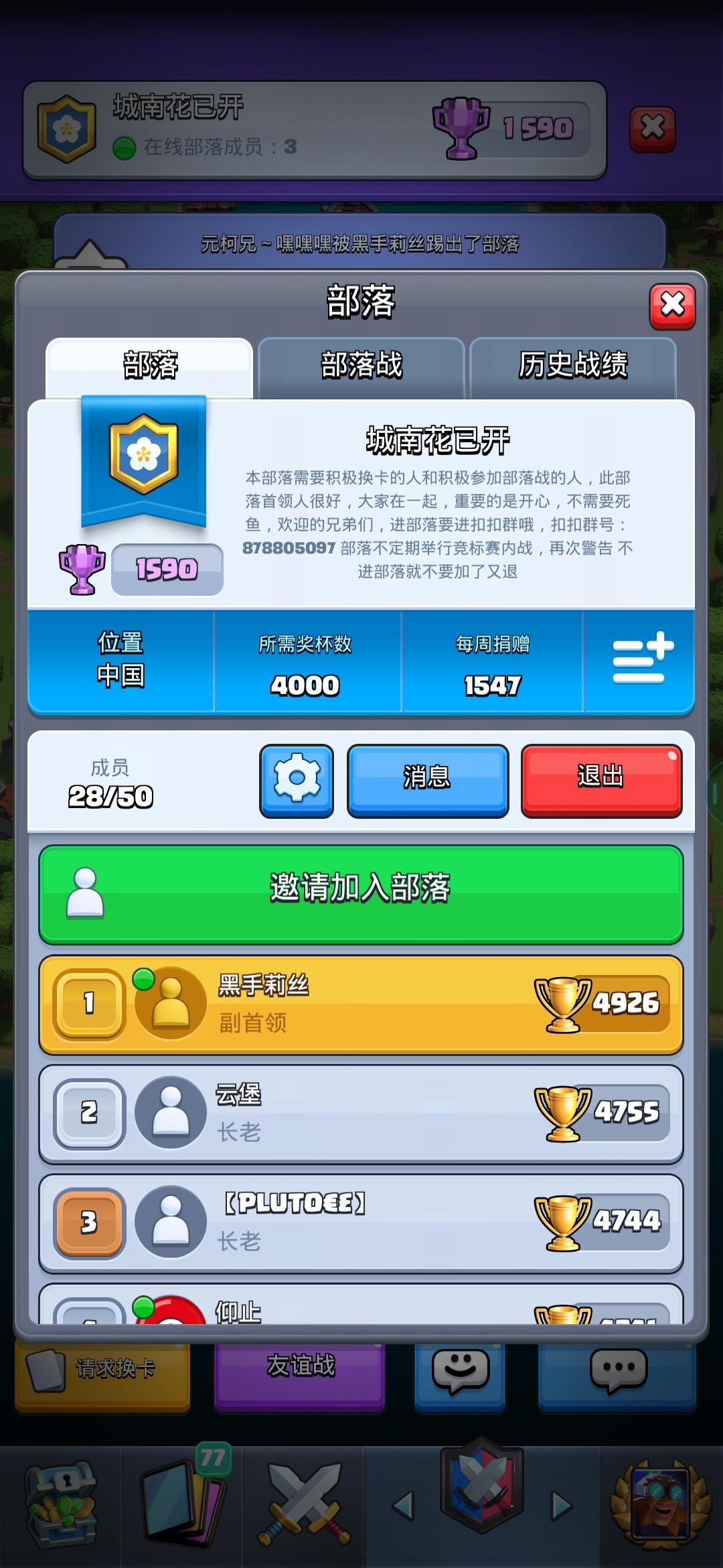 部落名:孤云这是一个强大和谐的部落!强大:周周第一!开打后正常48小时内到达终点!远远甩掉第二名无影无迹。周周人人奖励传奇卡!和谐:所有成员加微行群。探讨游戏。听从指挥。不肝不累。你要做的是:每天上线。每天第一时间打满4次部落战。每天大量捐卡。你能得到的是:周周稳定奖励传奇卡。瞬间收满卡。换卡积极。成功荣誉喜悦。部落名:孤云务必看公告先加群!!!