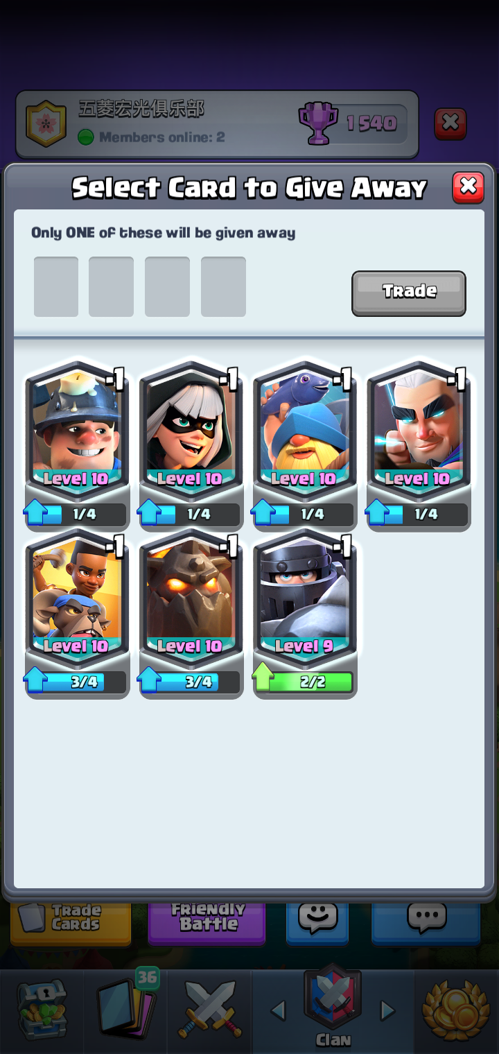本人2.6玩家传奇换一张(需滚木,除矿工外均可出)史诗换两组(需炸弹人,除黑王,毒,弩外均可出)稀有换两组(需野猪骑士,除女枪,冰人,火球外均可)职位在身,有意请进部落