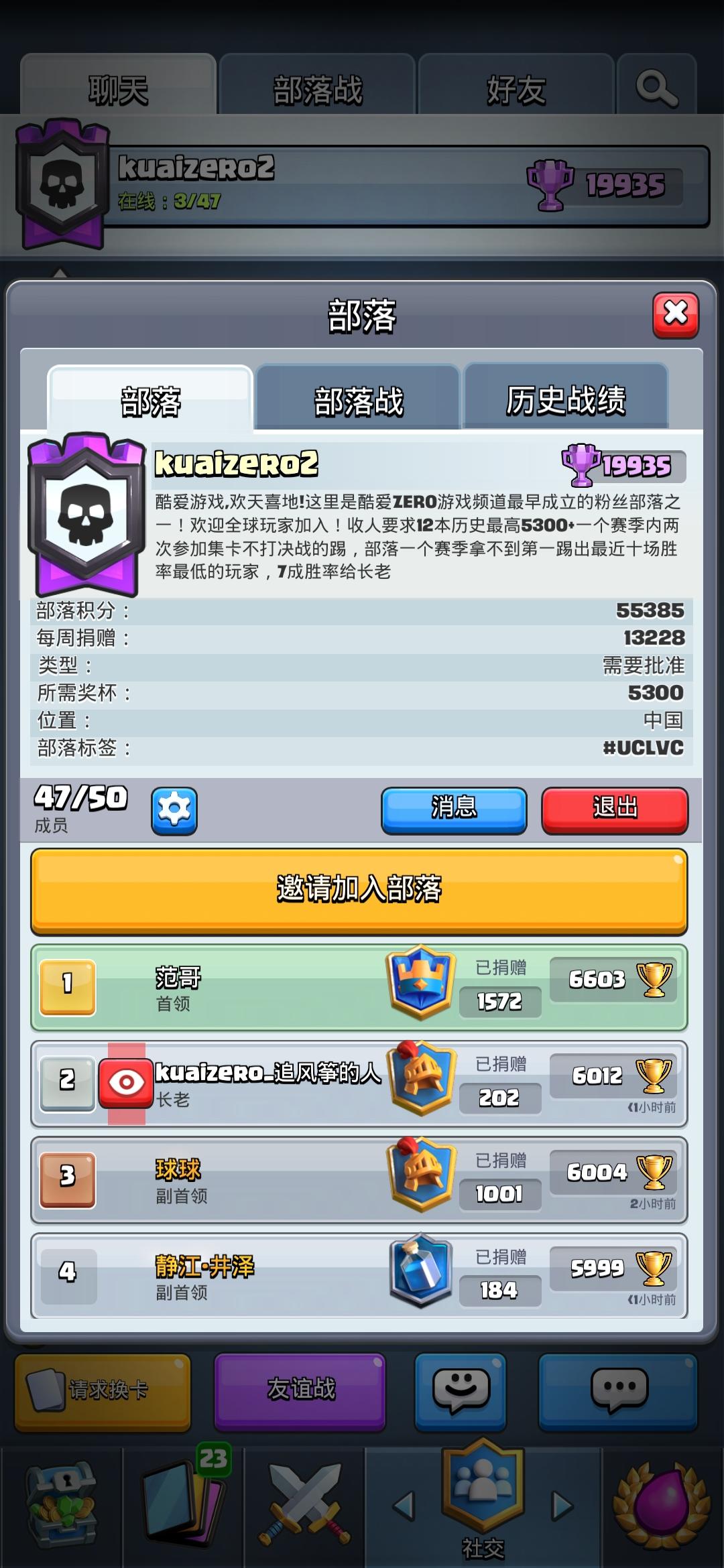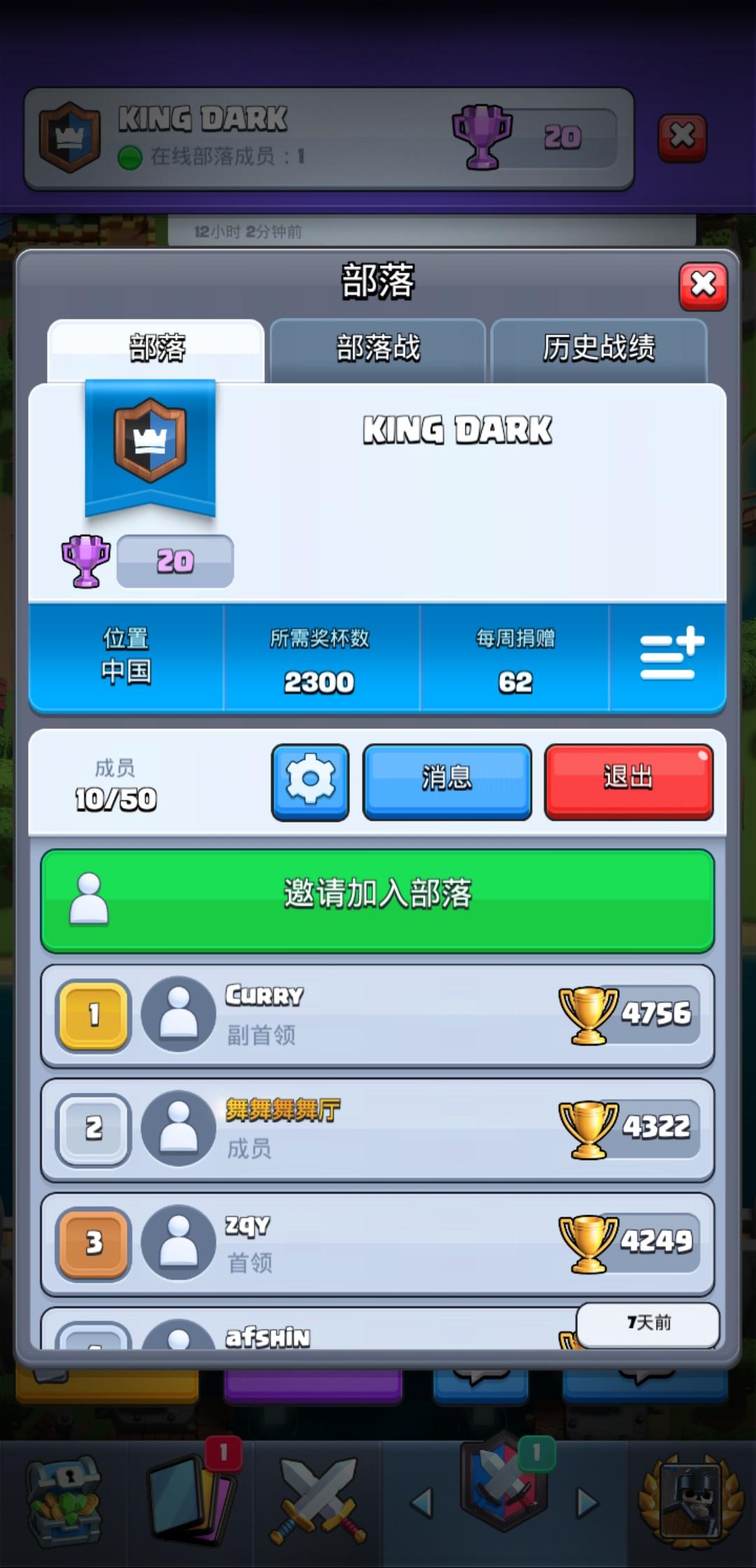 加我部落:黑暗之殿46人,要部落战贡献1000+打手,活跃上线,多捐卡交流,部落很活跃