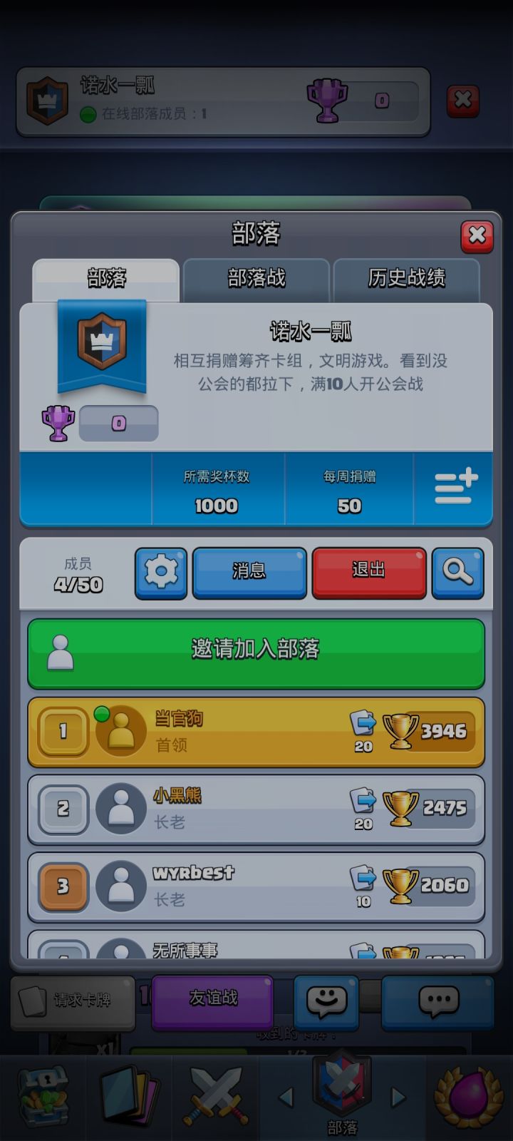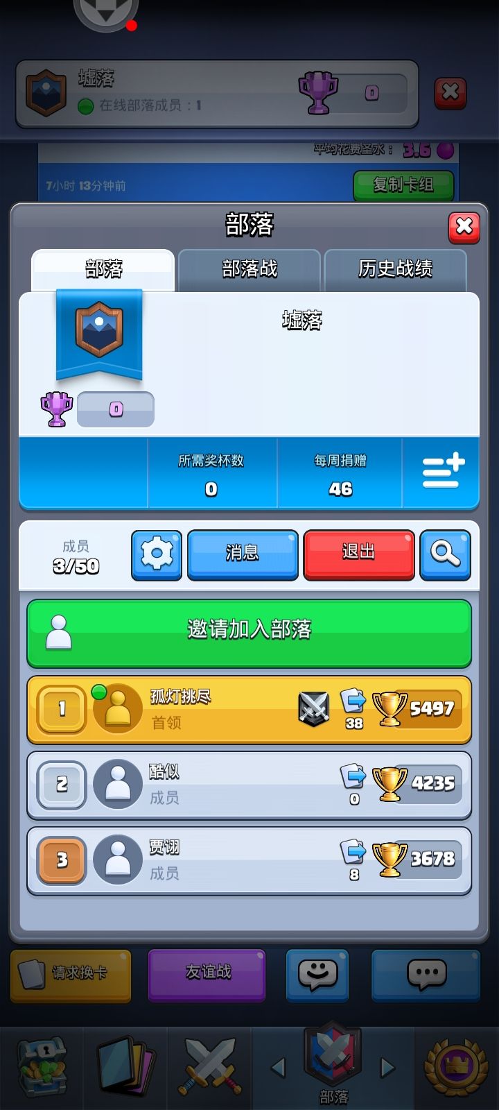 回归🤣有大佬或者萌新加一个不打部落战的养老刚创的部落吗🙂(就互相捐卡换卡,主要是不想肝部落战,然后咸鱼又老被踢ヽ(  ̄д ̄;)ノ所需杯数调零了,萌新也可以进)部落编号:#LJ0QC8UY