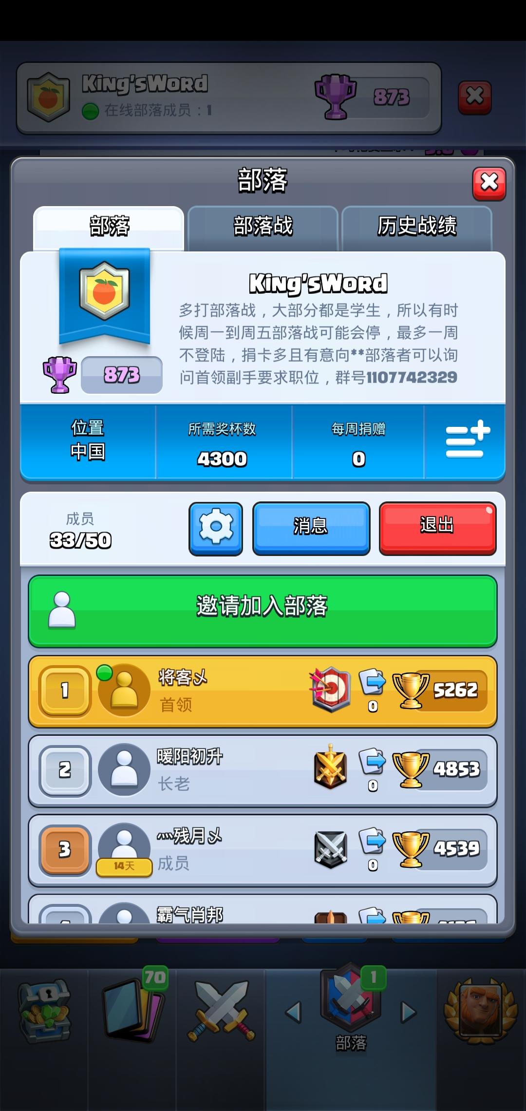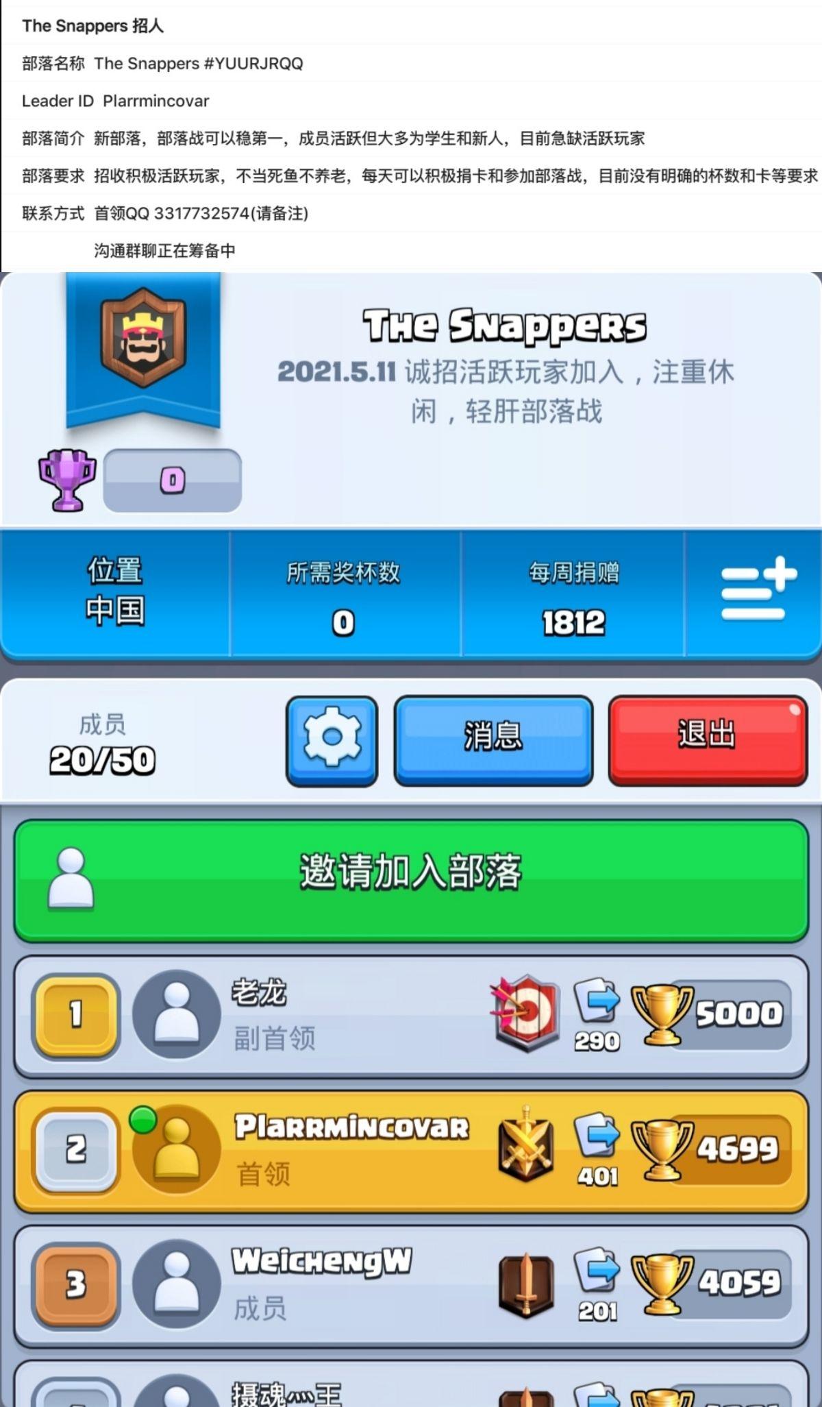 名字:养生堂 部落收人,要求部落战活跃,每周一周二参加部落战,打满就行。(实在不行挂机四场也行啊,一周一张传奇卡不香吗?)杯数4300,对赛季末冲杯无要求,欢迎新老玩家长期入驻。清理一些不活跃的,现在还有不少位置,欲来从速,可以进群讨论979122817