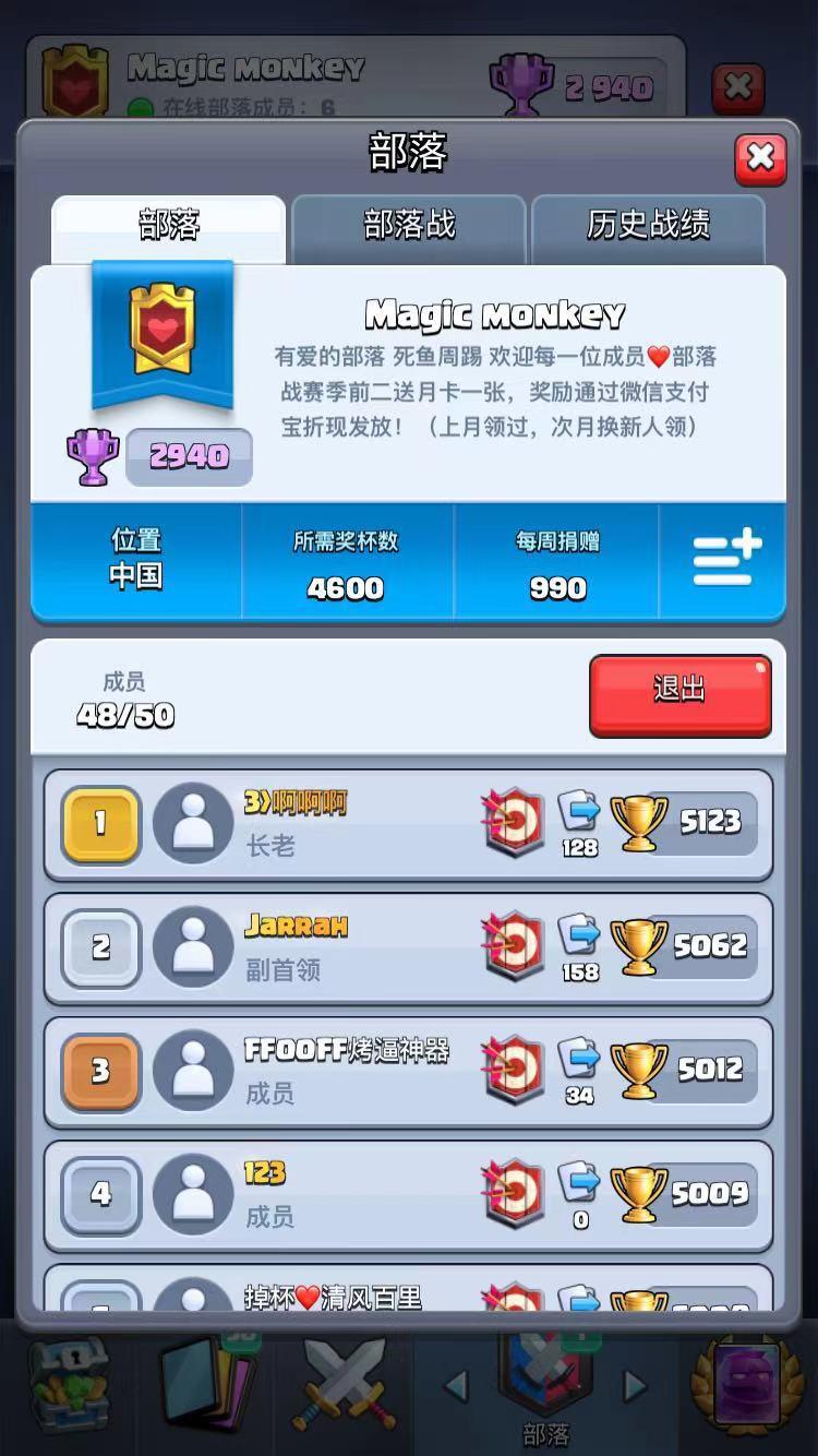Magic Monkey 部落招收4600以上活跃玩家,积极捐卡+参与部落战(最好打满),部落战参与度最高的两名成员可以获得⭐皇室令牌⭐!部落已经2940杯了,这个月就可以渡劫传奇了!欢迎加入!(๑•̀ㅂ•́)و✧