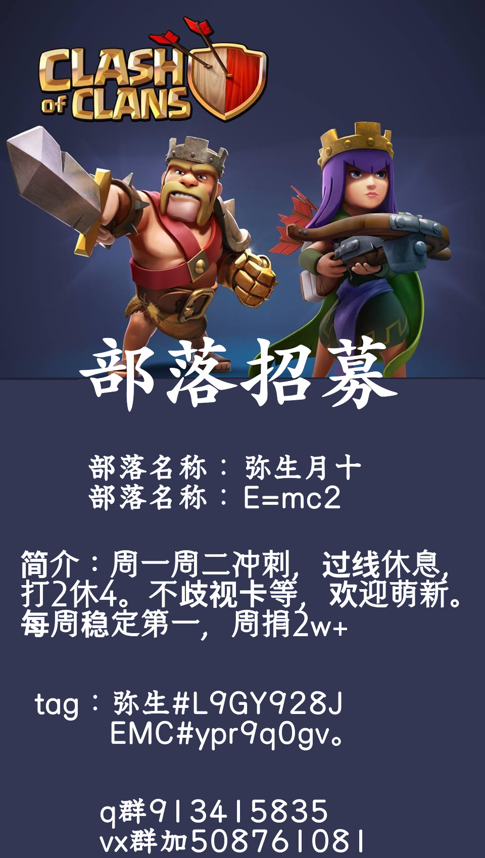 如题,部落招人,本人四个号,还有一个在别的部落看大佬回放,捐卡绝对少不了,马上开学了潜水也可xdm快来吧