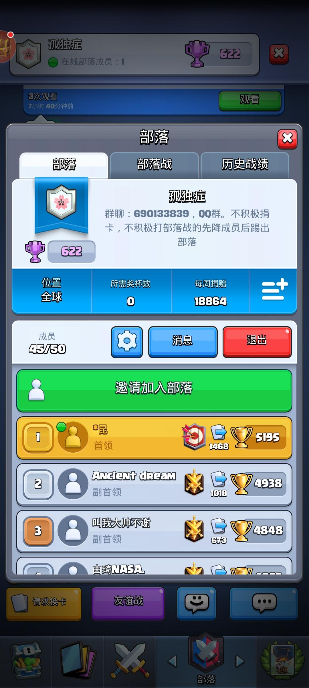 欢迎各位加入:黑暗之殿,本部落只收部落战活跃和捐兵狂。本部落每周部落战第1,必拿传奇卡