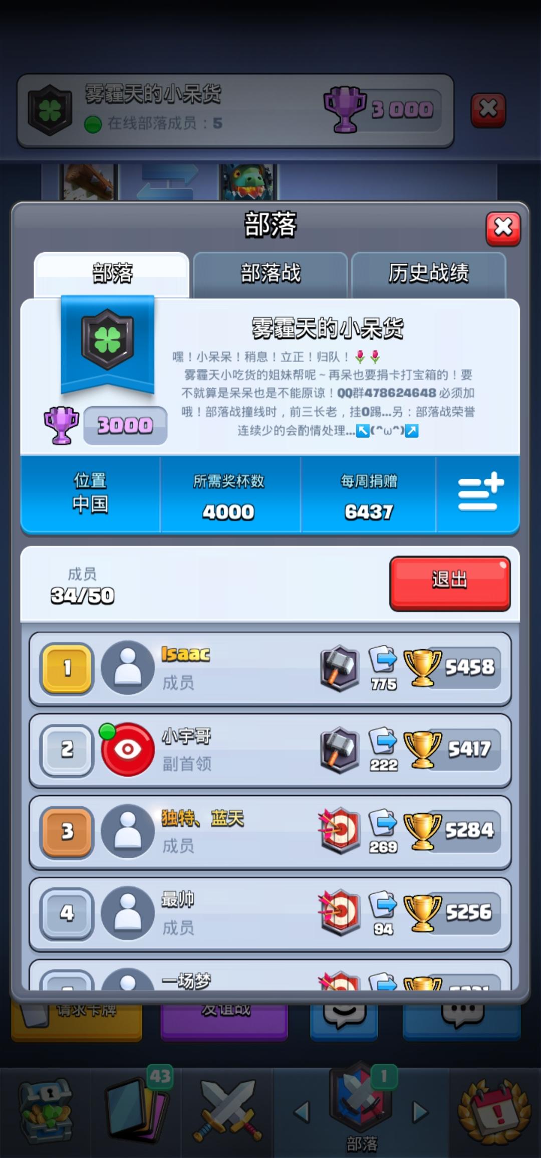 部落:黑暗之殿,目前47人,每周部落战第1,保拿传奇卡,要加入请一定要每天部落战6点准时上线打满4场部落战,最迟9点。每天部落战贡献350以上。,欢迎加入,本部落周娟20000+,求卡20分钟必定捐. 今天部落战打满4场,明天6点准时上线打满4场,欢迎加入。
