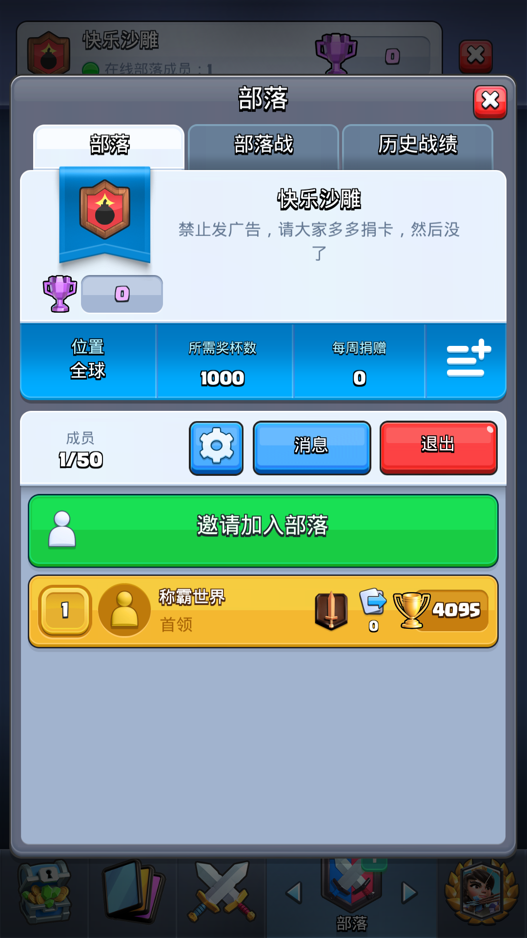 部落名称: 雾霾天的小呆货Leader ID: 蝶儿飞丶小甜入会要求: 不跑堂 申请即批 门槛4000招收部落战活跃分子 超级欢迎妹子,加QQ群478624648公会简介:嗨~宝贝们~你们等待的部落终于建成啦!美女首领带队,大神帮忙配卡组~伸手党您千万要无视这条招聘信息。稍息!立正!归位!不捐卡不打部落战的话就算是呆呆酱也不能原谅哦~