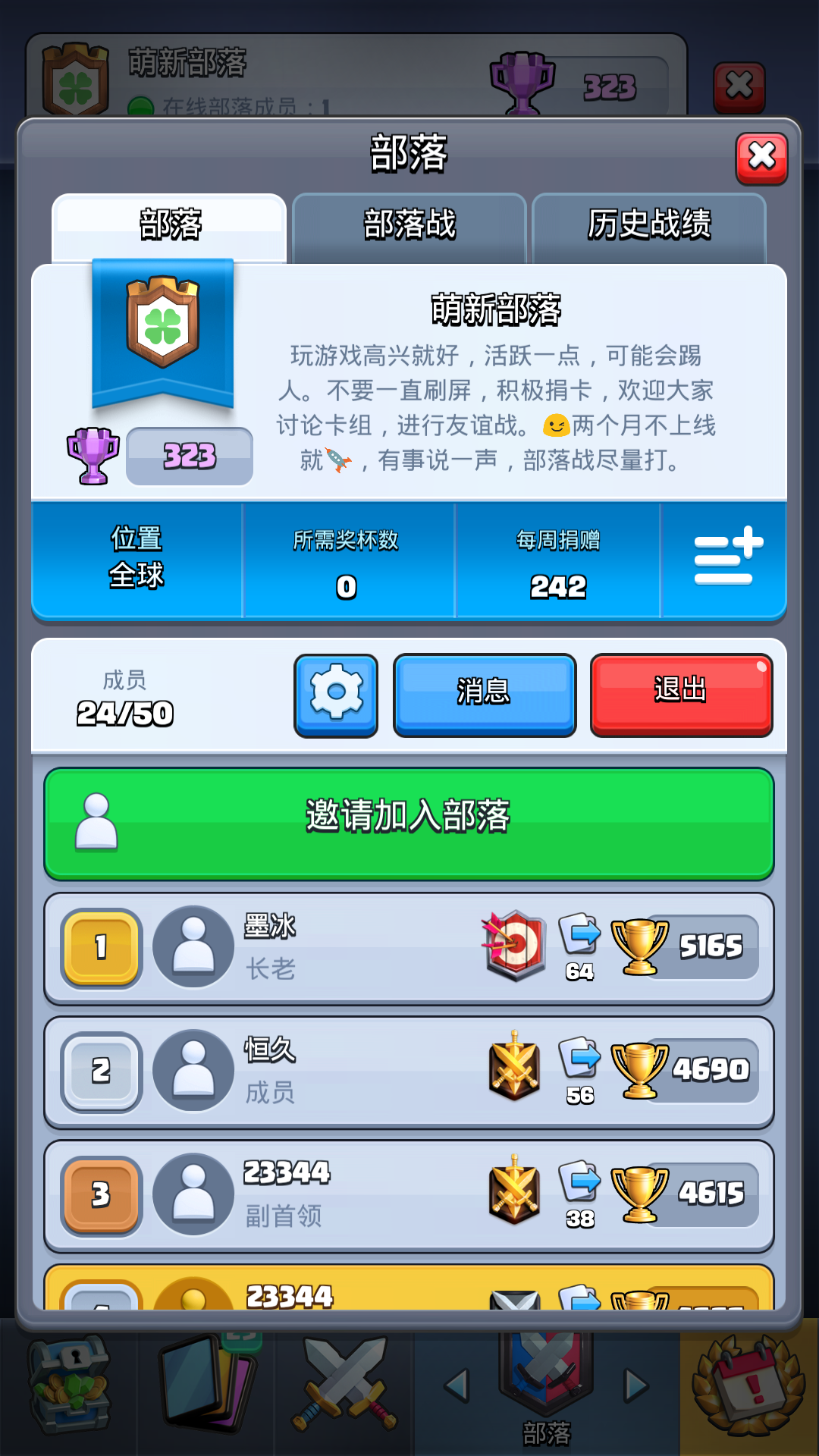 部落非常活跃,里面有萌新也有老玩家,周捐基本上都要两万,部落战每一季都打,部落不设门槛,喜欢就来。
