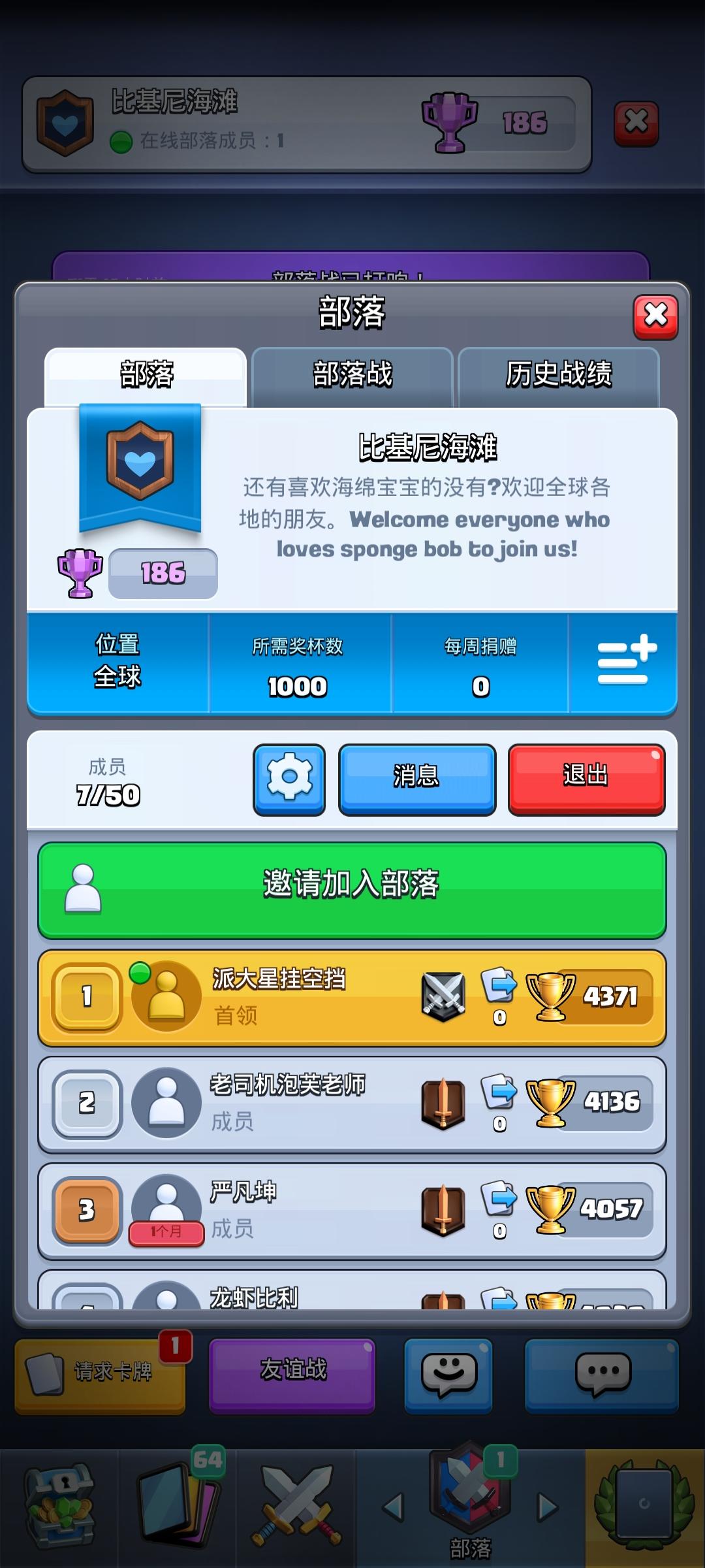 人多的时候搞个分布,名字非人哉,请活跃,请打部落战,请捐卡,这三点必备,并且空余时间讨论战术聊天也可以打打友谊战娱乐一下,甚至打个娱乐赛,,我就4500,需要大佬指点!这是我们部落的第一张传奇卡牌,正好老哥到11级了哈哈哈(ಡωಡ)hiahiahia,现在20多个,能不能到40个就靠你们了加入我们!(注:部落名字为非人哉,图像是个蓝色雪花不要加错,名字无嘲讽意义,只是我喜欢的一个动漫名字,哔哩哔哩