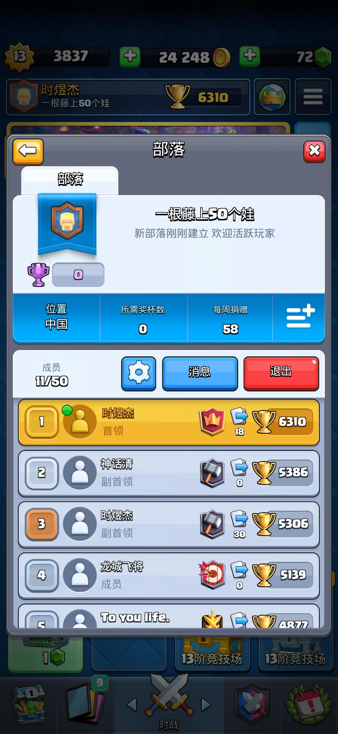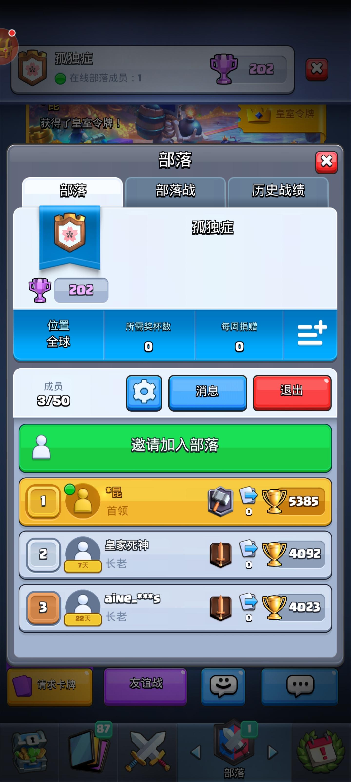 皇室战争新部落招人 只要你够活跃就好了 不限等级 技术哦 积极捐卡 就送长老副首领哦
