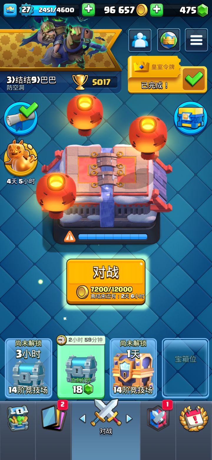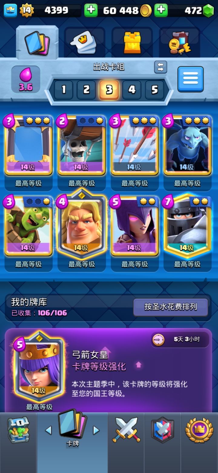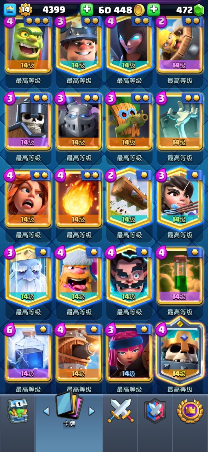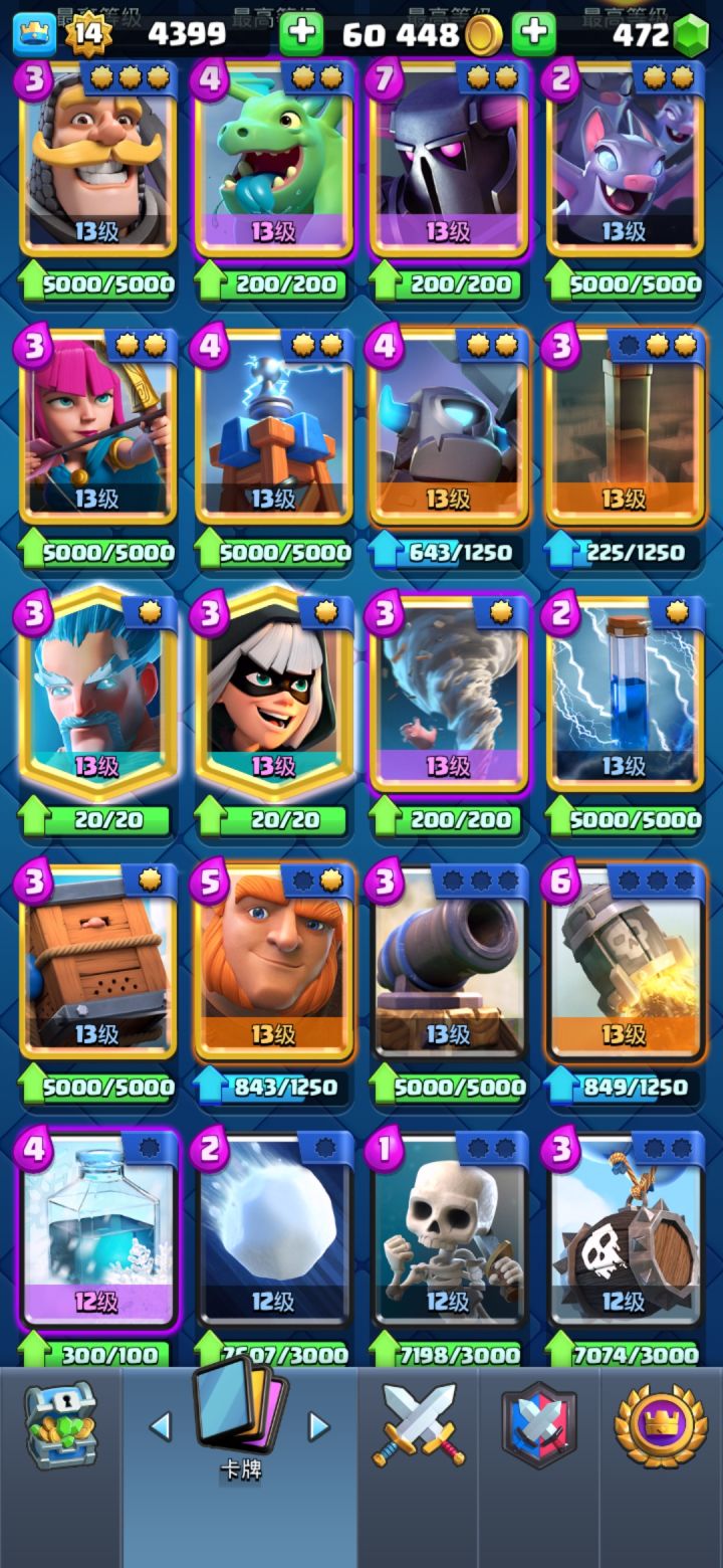 各位没把卡牌解锁全的尽快从各种渠道解锁,等更新之后塔等不够不让进下一个竞技场,到时候有的卡别人都有就你没有特别膈应人,然后就是金币别攒了,有什么升什么,把塔等堆到十二级以上,更新后十二级对应十六阶竞技场可以获得英雄卡。