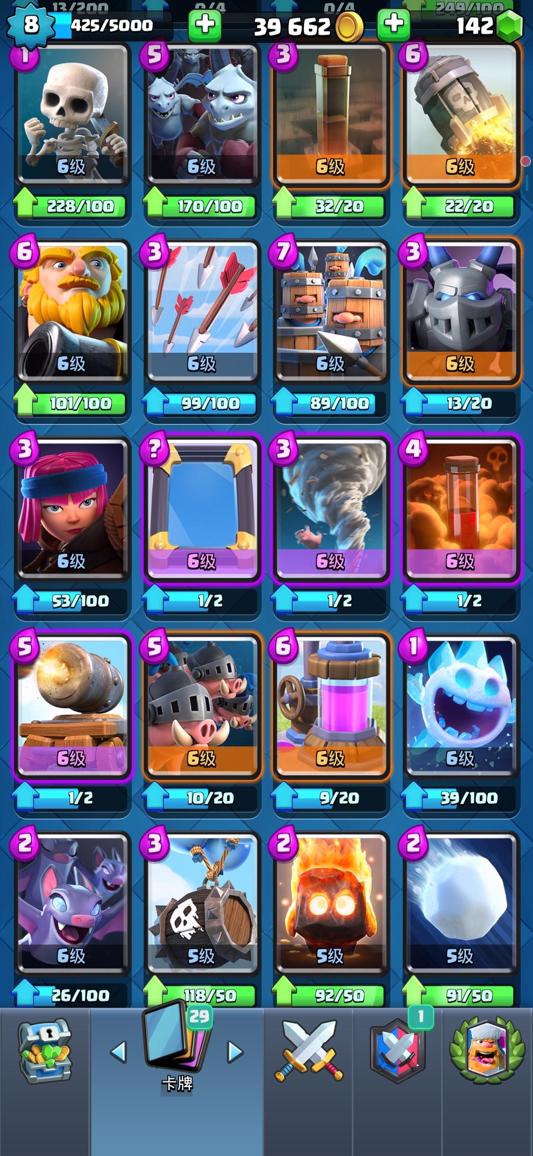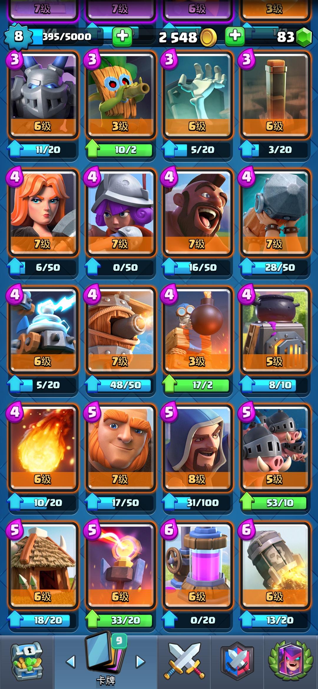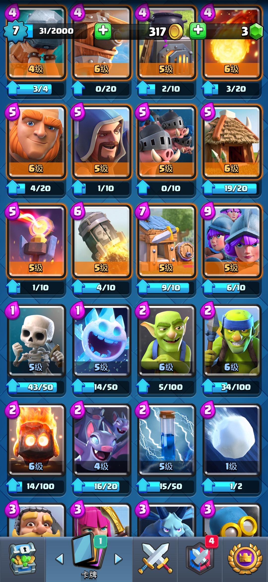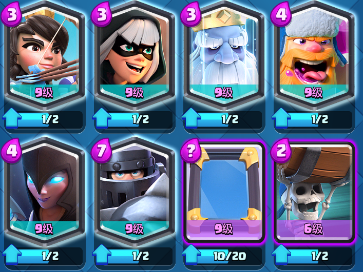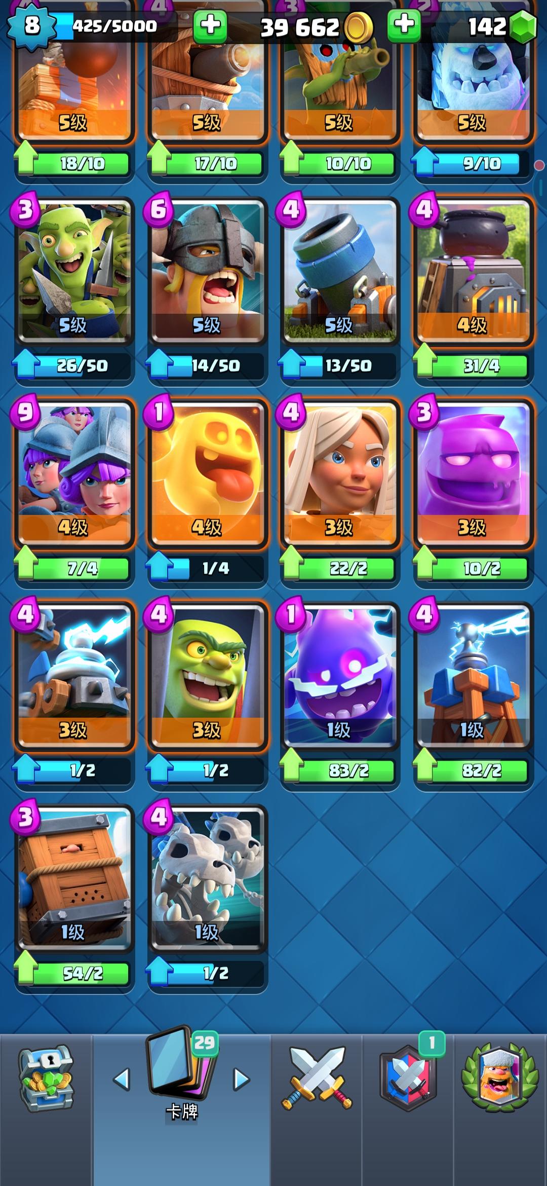 好难呀,玩了四天了才2600杯,传奇卡就一个樵夫,等级最高的卡才八级,而且老是匹配比我高两三级的对手,可以配啥整容呀,两千杯之前都是用人海偷家战术,两千杯之后就不行了😅,而且这皇室令牌的东西一天解锁一个,我都满级了才解锁到第十二个