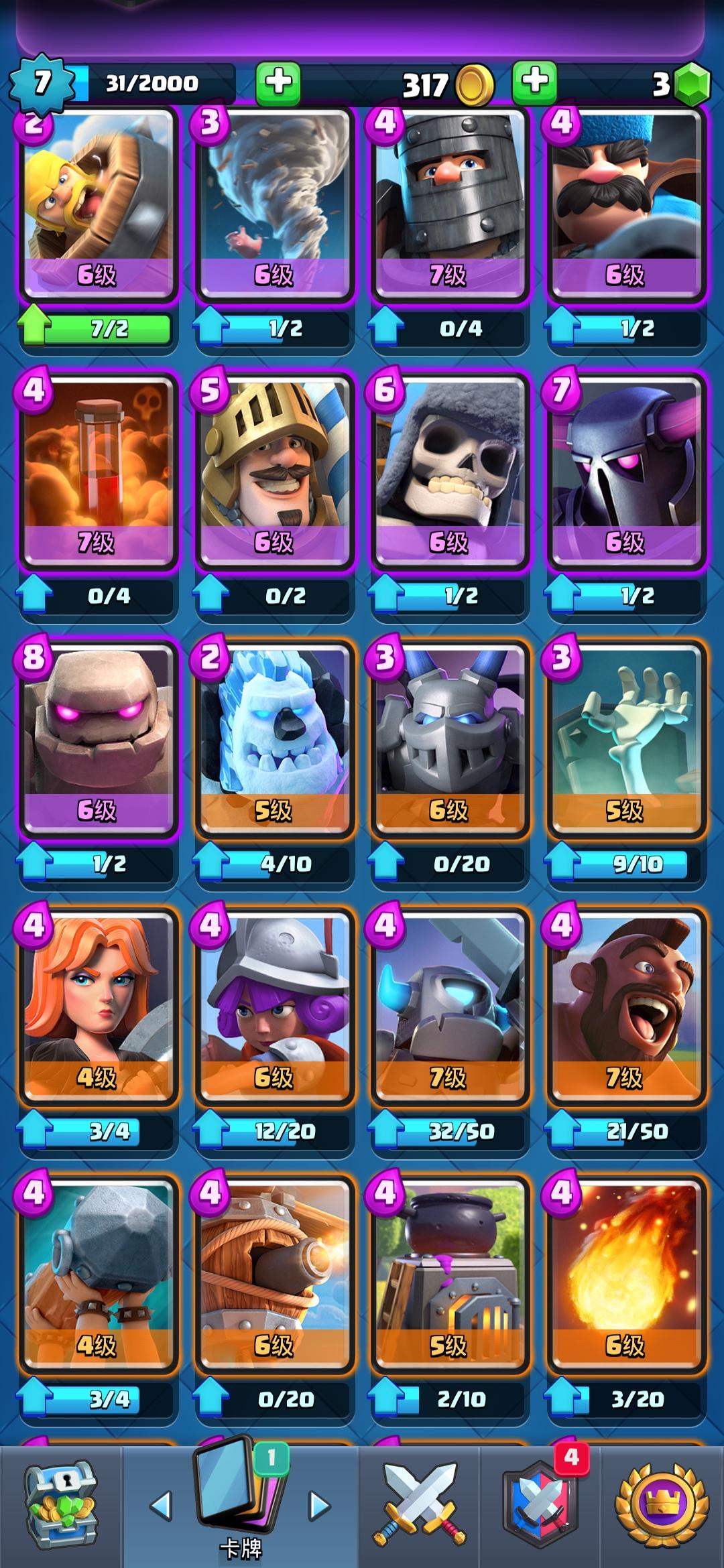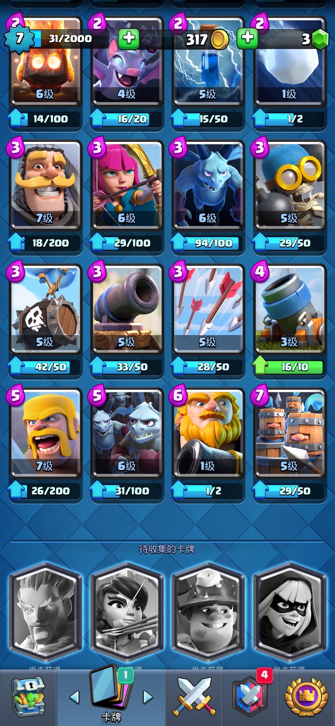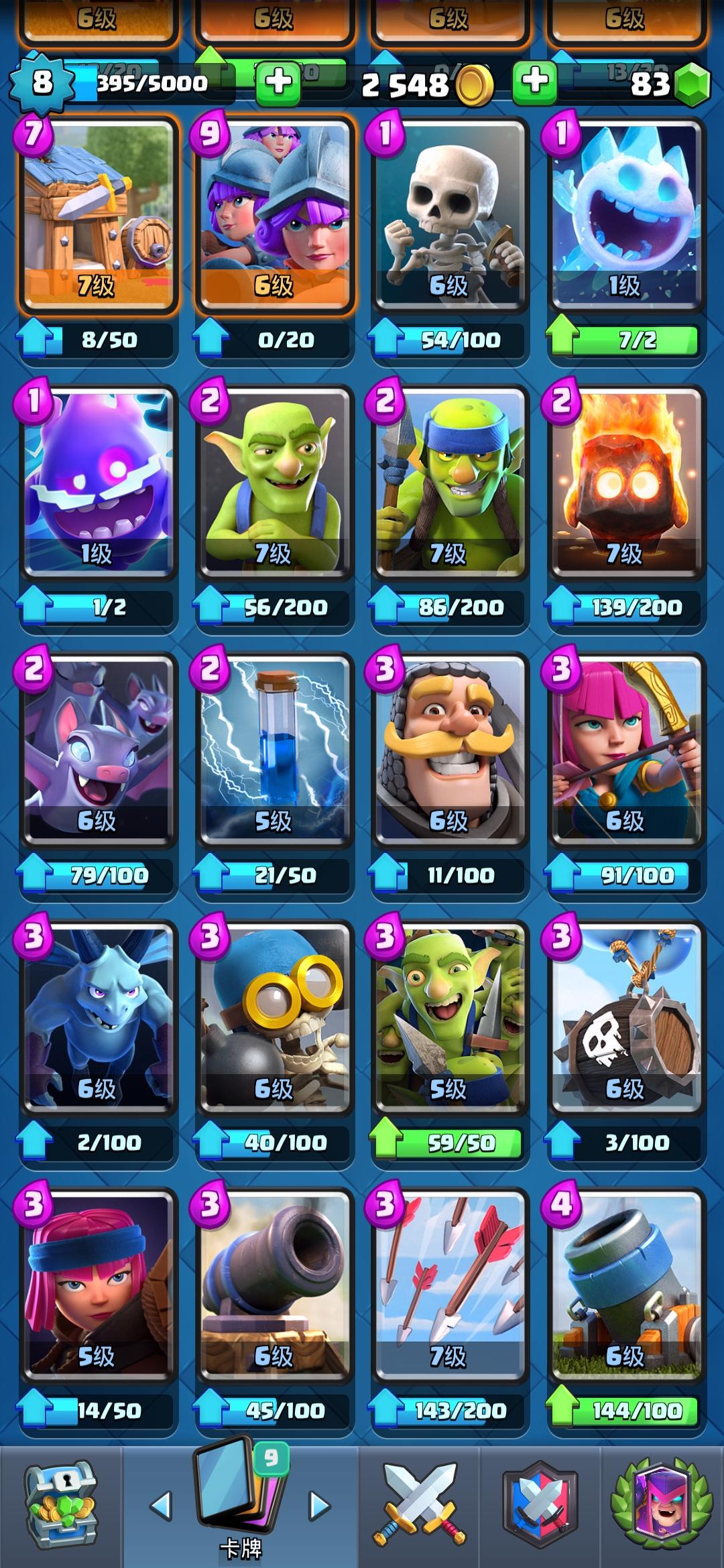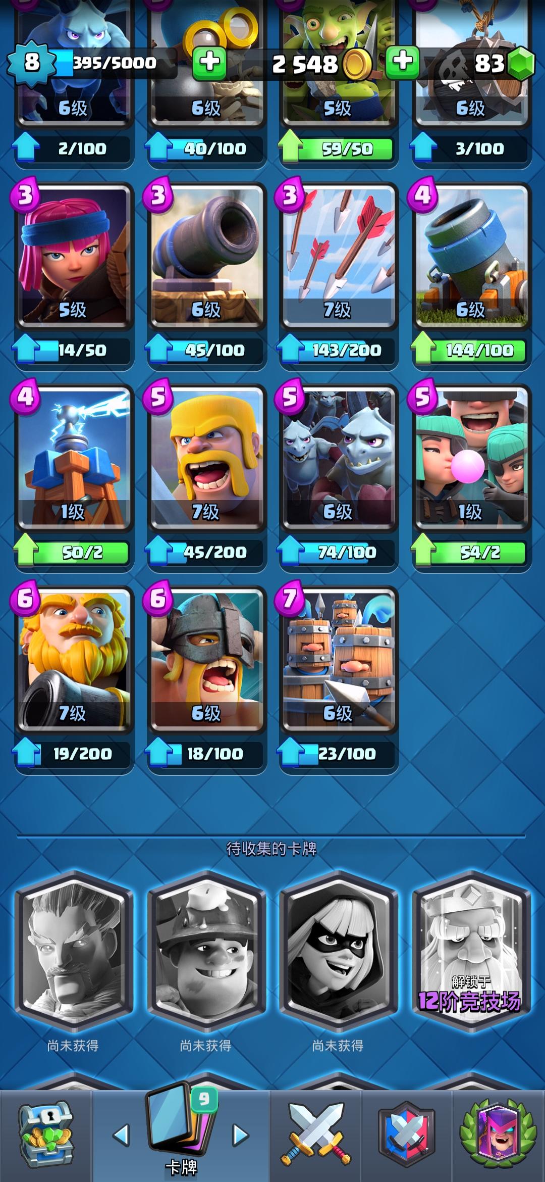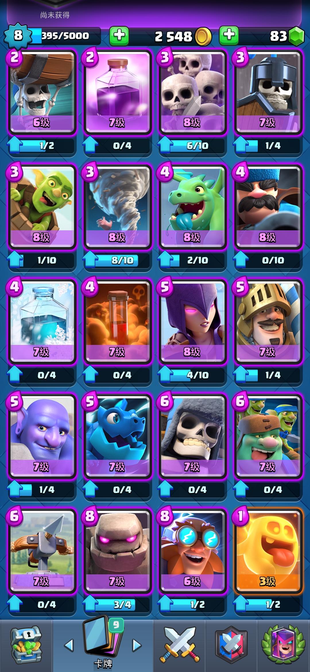 好难呀,玩了四天了才2600杯,传奇卡就一个樵夫,等级最高的卡才八级,而且老是匹配比我高两三级的对手,可以配啥整容呀,两千杯之前都是用人海偷家战术,两千杯之后就不行了😅,而且这皇室令牌的东西一天解锁一个,我都满级了才解锁到第十二个
