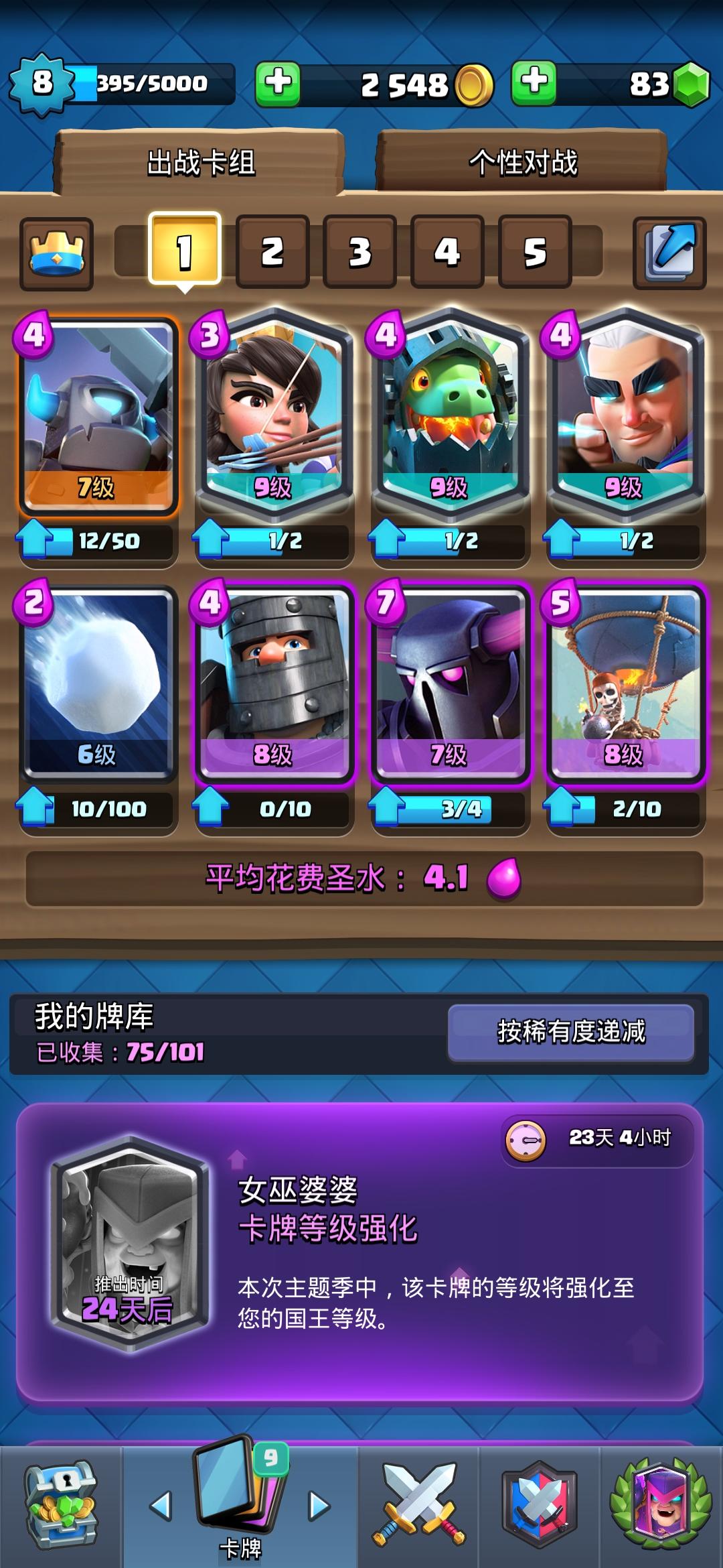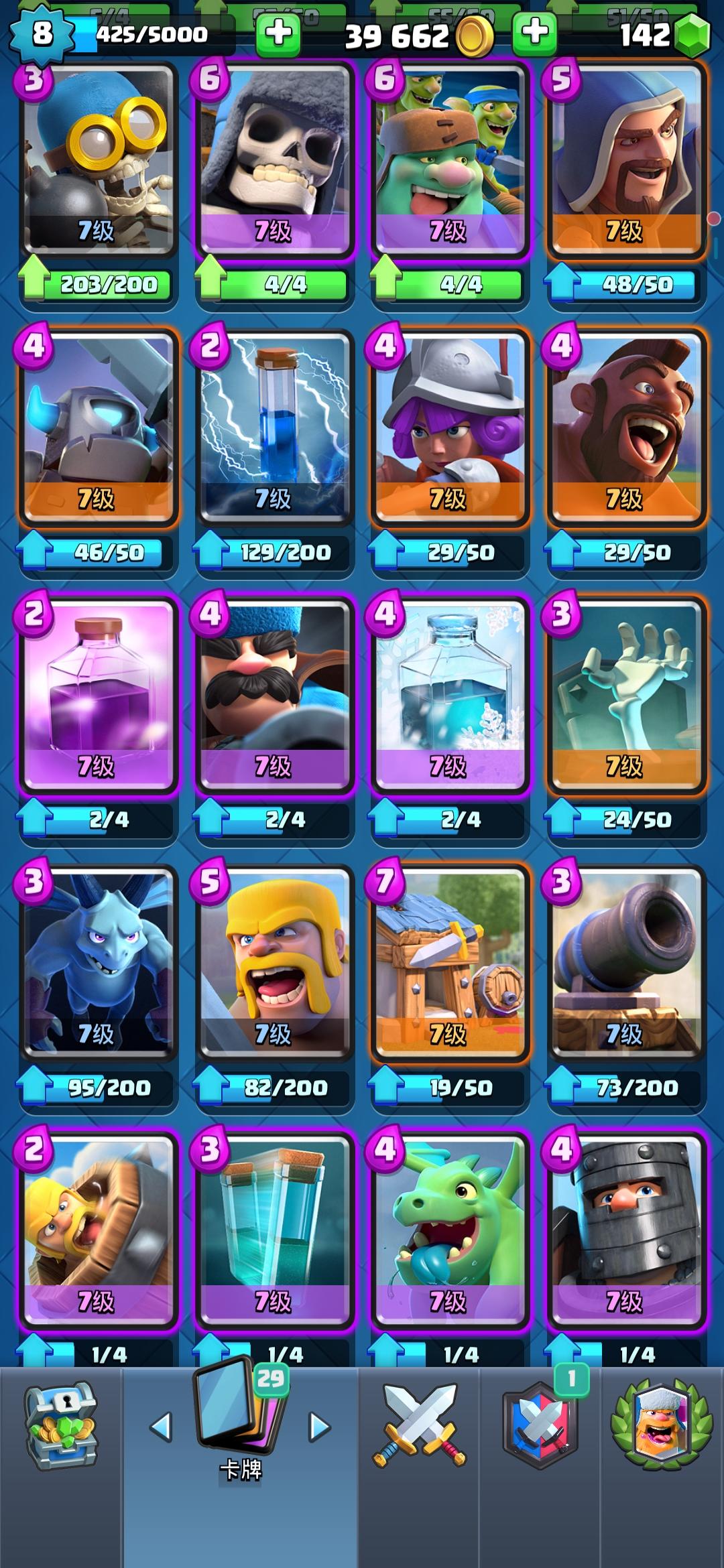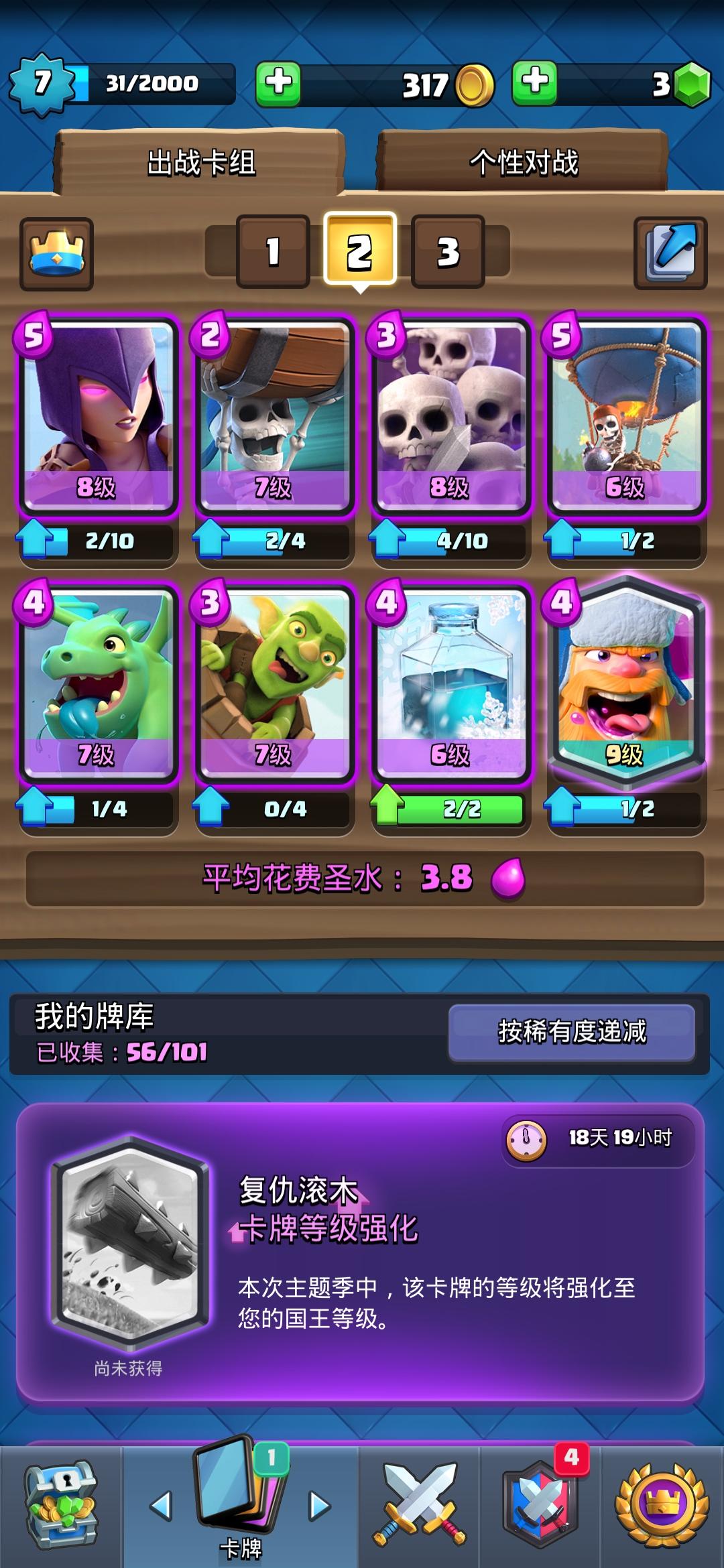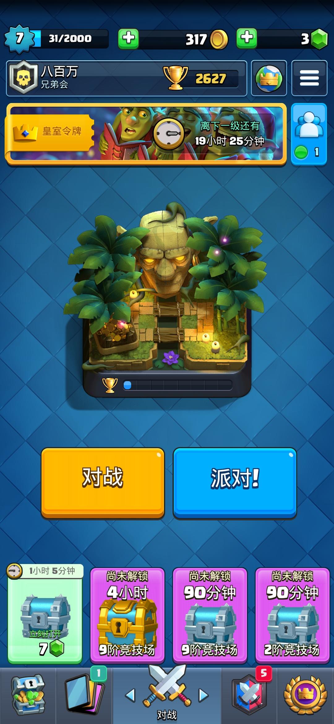 好难呀,玩了四天了才2600杯,传奇卡就一个樵夫,等级最高的卡才八级,而且老是匹配比我高两三级的对手,可以配啥整容呀,两千杯之前都是用人海偷家战术,两千杯之后就不行了😅,而且这皇室令牌的东西一天解锁一个,我都满级了才解锁到第十二个