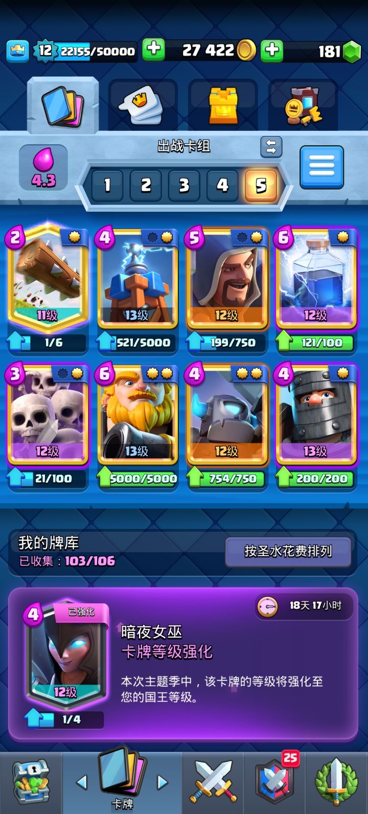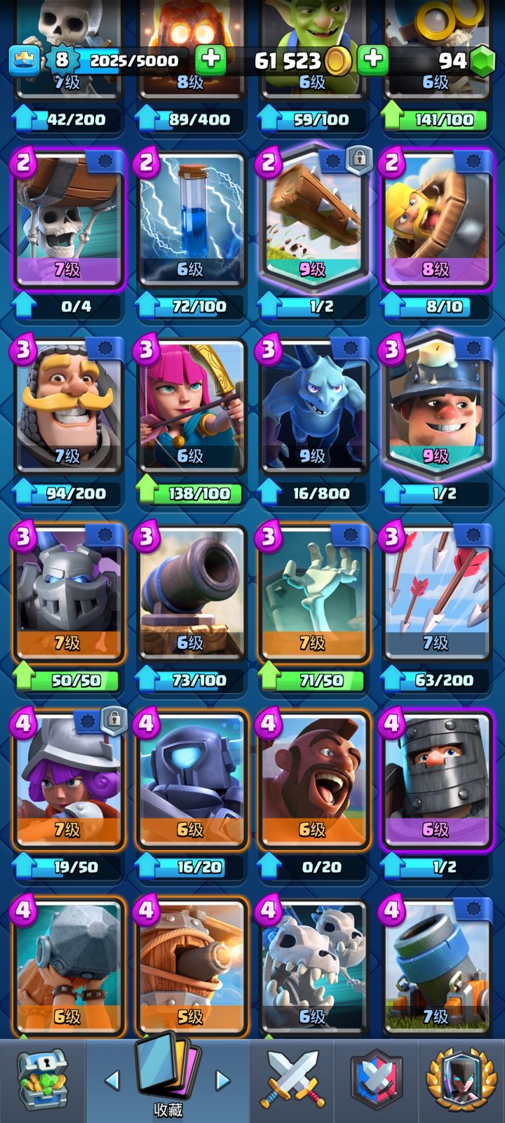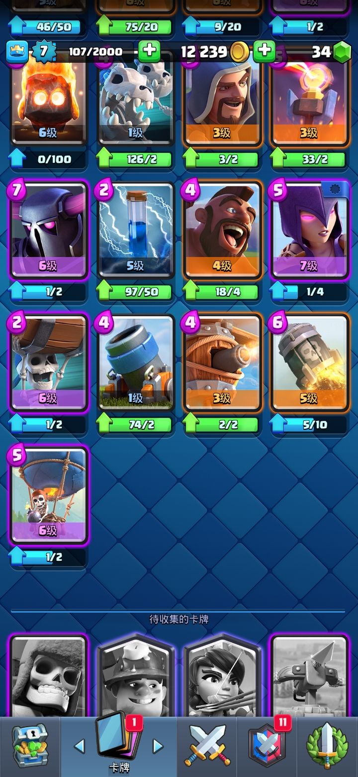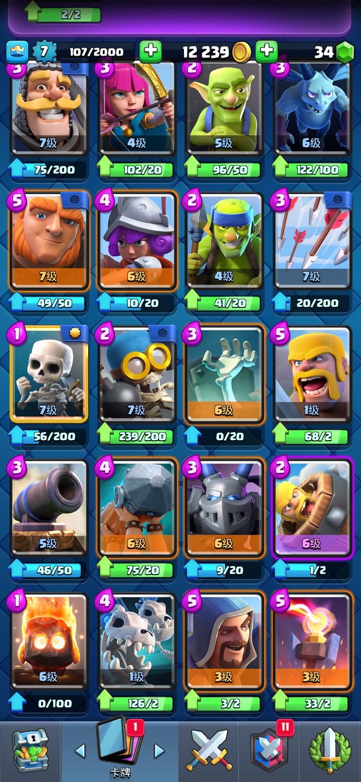 有没有大佬能看一下我的卡,能成什么厉害,卡组我打不上去了。再问一下传奇魔法外卡是升滚木比较好,还是拿去换或者留着。