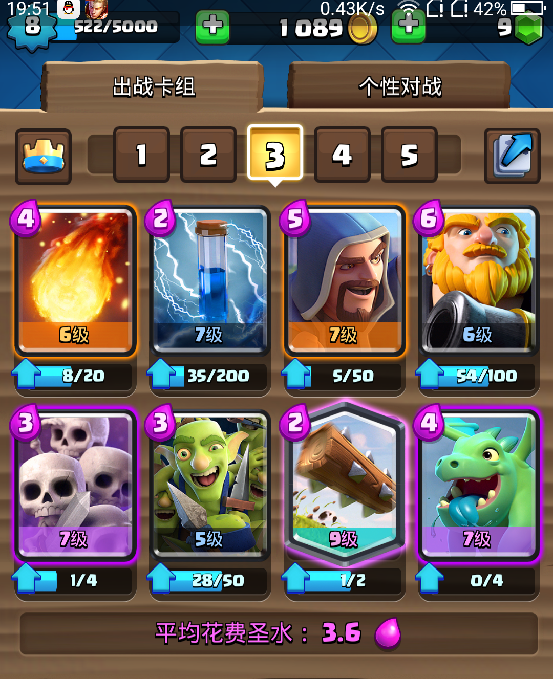目前4300杯左右,卡还缺蛮羊,冰法,矿工,暗巫。本来是打三冲,但觉得防守压力太大,就把毒药换成游侠,黑王换成幽灵了。