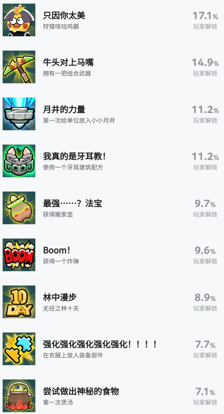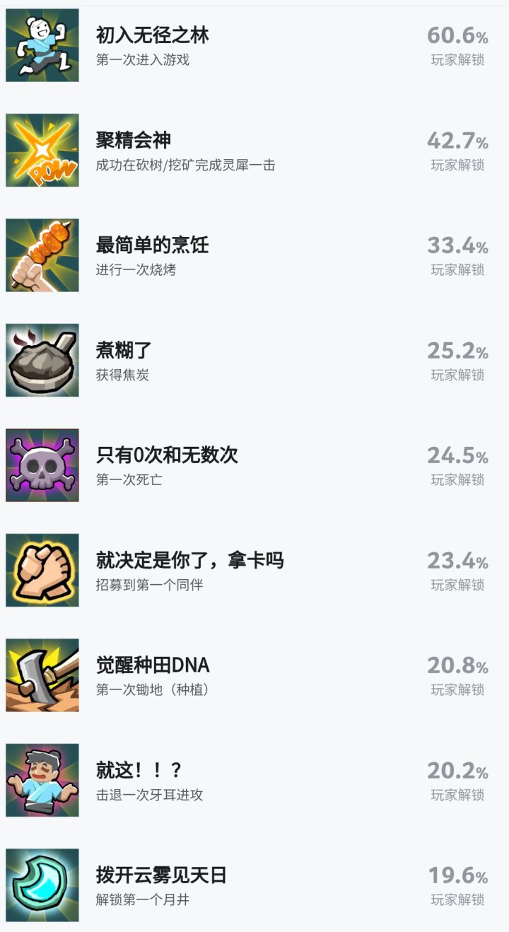 关于成就收集方法,图片上也有,比如[初入无径之林]就是第一次进入游戏,其它的都可以照着这个例子来收集成就。有一个比较难搞就是最后做出营养超过500的汤,想要做出这汤就必须有[陶锅]注意一下不是[陶煲],想要做出[陶锅]前提是要有[陶锅泥坯],而[陶锅泥坯]需要[制陶平台]才能制作,[制陶平台]需要先制作[青铜轴件]才能解锁图鉴,这些弄好后就是制作出[陶锅]了,然后往石头火堆架一个烧烤架子再举起陶锅