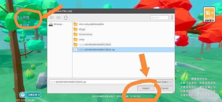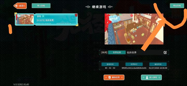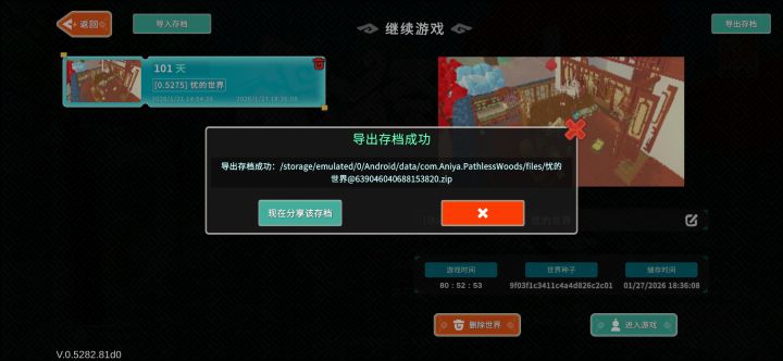 如图所示右上角导出,选择Unity文件夹,按Save,即可导出成功左上角导入,选择复制好的zip文件,按lmport,即可导入成功(如果想卸载重装,建议先尝试以上步骤,确认都能成功再进行下面的步骤)导出的存档存档的位置点内部存储,选Android文件夹,选data文件夹,选com.An…sWoods那个文件夹,选files文件夹,看到的蓝色的zip文件就是复制好的世界资源(开头世界名称结