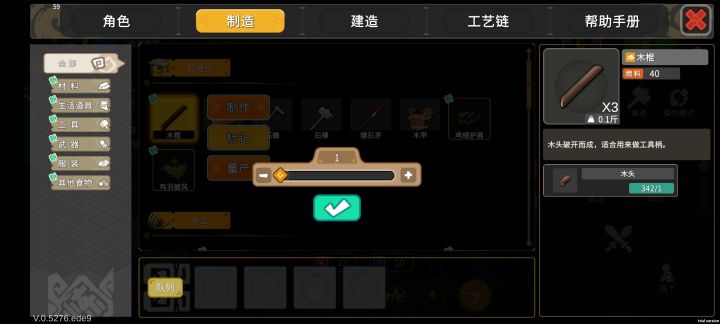 封面图(图一)当我的可燃烧材料比较多时,我想滑动到底部进行查看选择,但我无法进行有效的滑动,且直接添加了我的木头。我在图二进入制造页面,当我在图三滑动量产进度条时,会直接触发图二的其他设备,跳出当前页面。我第二次进入已有的世界,角色时仍触发了重复的教程,希望在设置页面提供关闭教程选项。