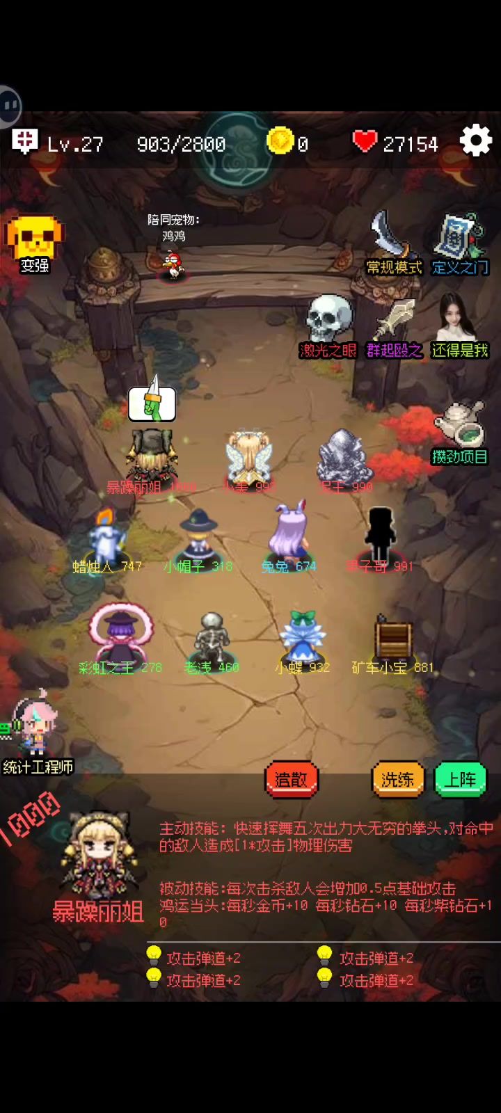 红色英雄是靠洗练刷高分词条刷出来的,名字旁边的数字就是分数(我一开始还以为是只能开蛋开出来红色的,前期疯狂开蛋),刷钱把初始的丽姐洗成红色,主要选击杀加攻击或其他攻击词条进入游戏→右侧“攒劲项目”→无尽挑战→群起殴之→开打,属性点点攻击撑前期,多点点天使打了拿经验,每10级可以在右下“支援技能”中选一个英雄的主动或被动技能,先选“音乐专家”的主动技能回血加血上限,再选“蜡烛人”的主动