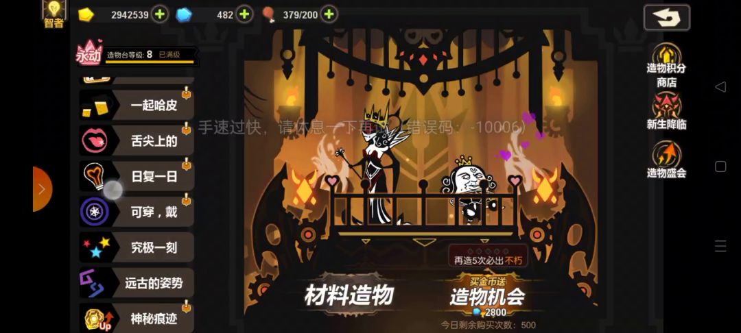 具体情况就是我之前用自动合纹章,合着合着发现停不下来了然后就想点那个X后面就因为没有金币停了下来,再后面就一直显示手速过快,又因为要开学就把游戏卸了,最近重新安装以后就是这个鬼样子。