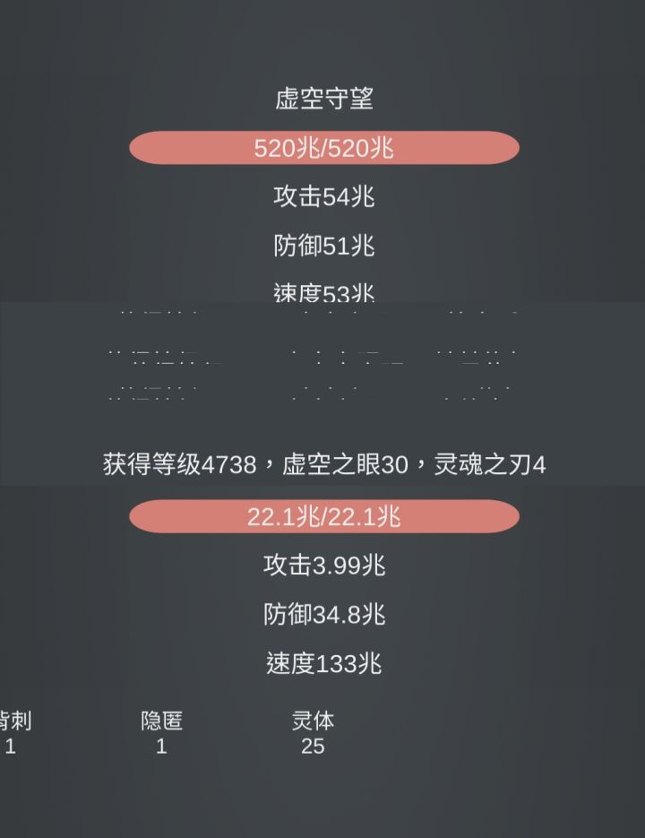 攻击: 6.46 兆 防御:7.69兆 1破甲 4斩击 5嗜血 4三连斩 2流血 4重击 5御盾 1盾反 1动如雷震 3魔法弹 3魔法盾 5魔力赋能 3寒冰弹 2背刺 4唤灵 2灵体攻击 4融合 注:照抄属性,攻击别动,防御可以多加点