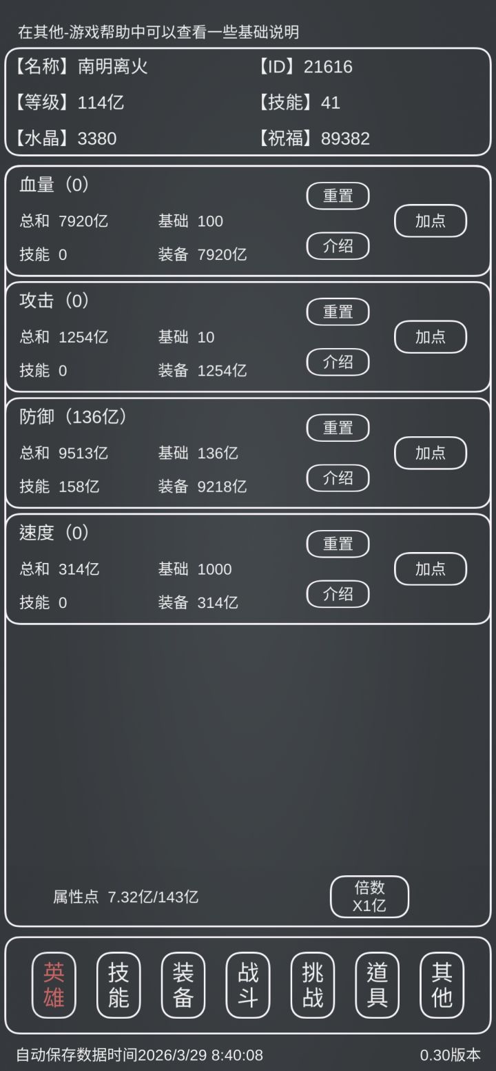 技能:4唤灵 5融合 5极速 5背刺 5隐匿 5嗜血 29技能点 多的加御盾装备:千万陨石源盾 两百万陨石源器 属性 65亿防御 461亿速度 修改于0.30版本效率60%