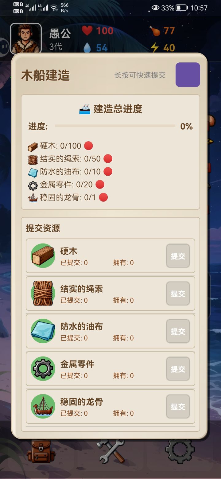 开荒的事太累,还是不要让我的子子孙孙来了,直接一把通关。基本不用看广告。开局:先摸石头然后选择往北走进入下一个地图(丛林)砍树砍三次,先把石斧做出来,装备上后摘个果子体力为0,第一晚先在野外睡一觉然后继续砍树。体力到50的时候选择往北走去山洞,挖掘矿石,把火给做了。然后继续去砍树把石镐储存箱竹矛工作台茅草屋工作台搓出来。开局优先等级:竹矛>石镐>存储箱>茅草屋>工作台前3天可以在野外睡