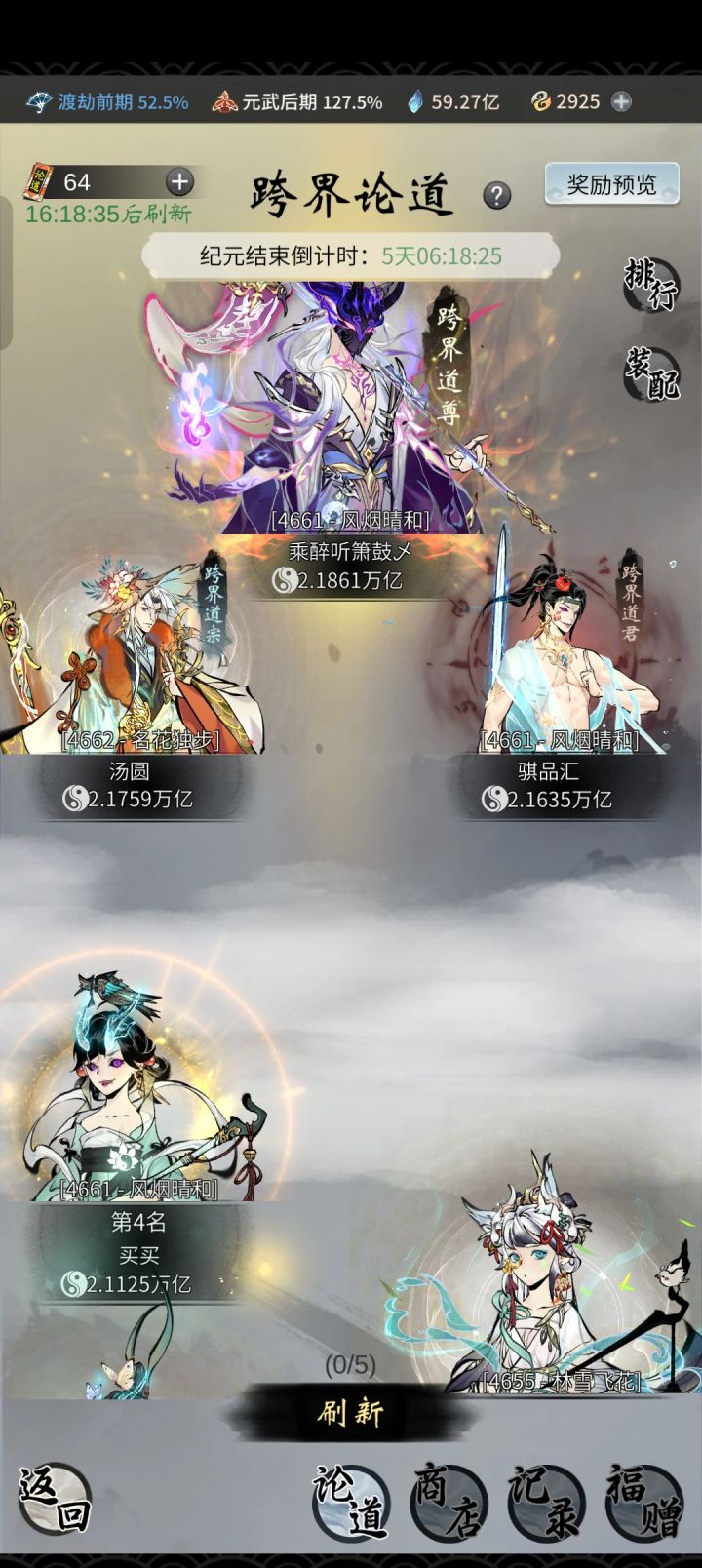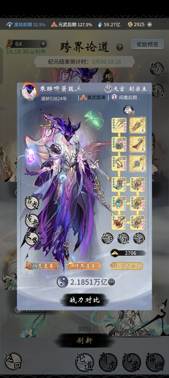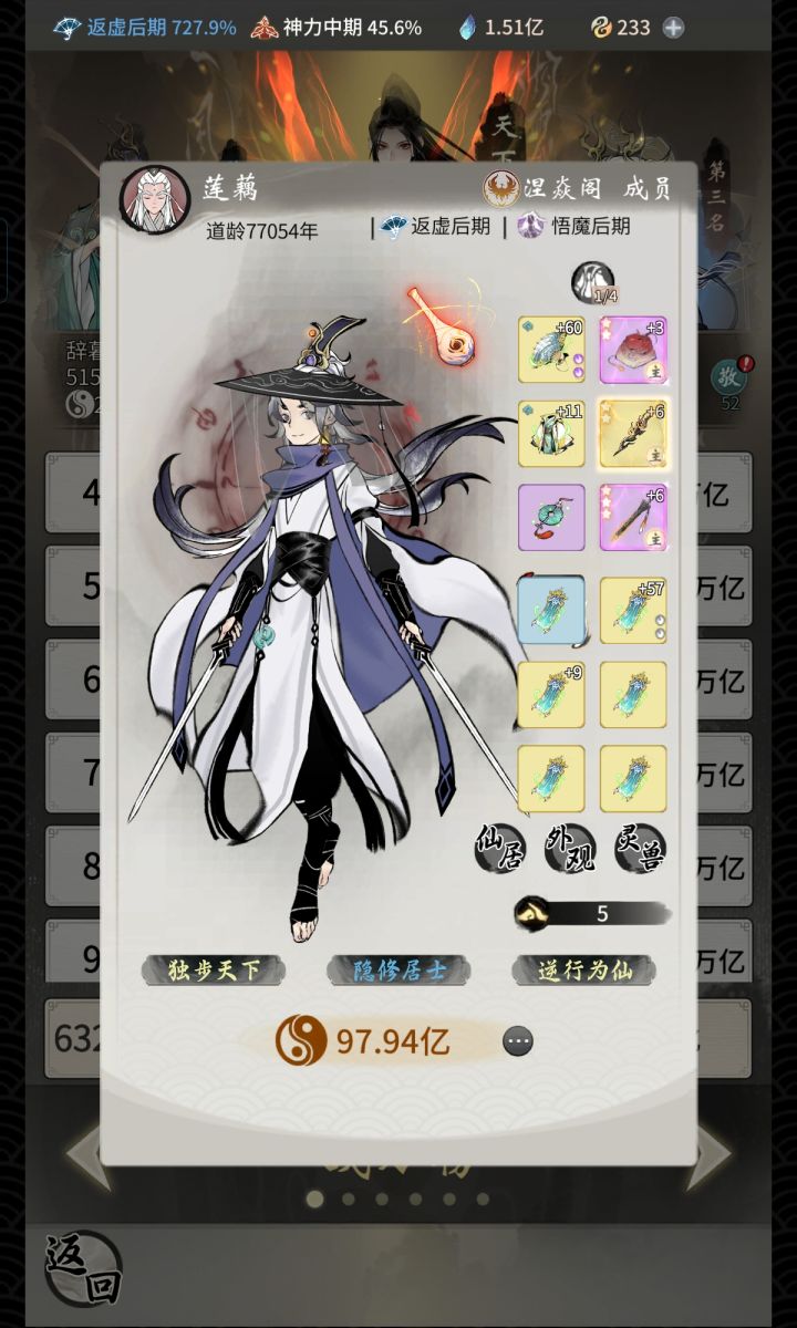 图一图二是我们跨界论道的榜一大佬境界图三四五是我的本人的状况,因为之前有很长一段时间不玩落下了,现在玩感觉没得什么体验感,也不舍得我这六百块钱三至宝,但是感觉佛系慢慢玩也行想去新区体验体验一下,但是感觉竞争很激烈,顶多也就双月卡,也不一定抽得到至宝买号的话,感觉现在基本都是成品号,低境界的满至宝号又没看到所以现在要咋样才好,请大佬给意见#一念逍遥 #一念逍遥游戏 #一念逍遥三周年