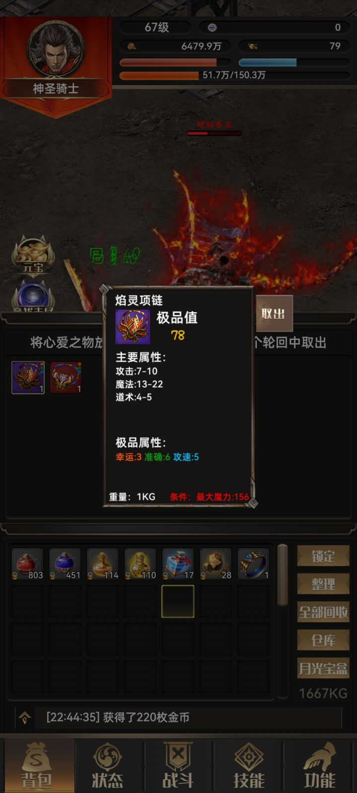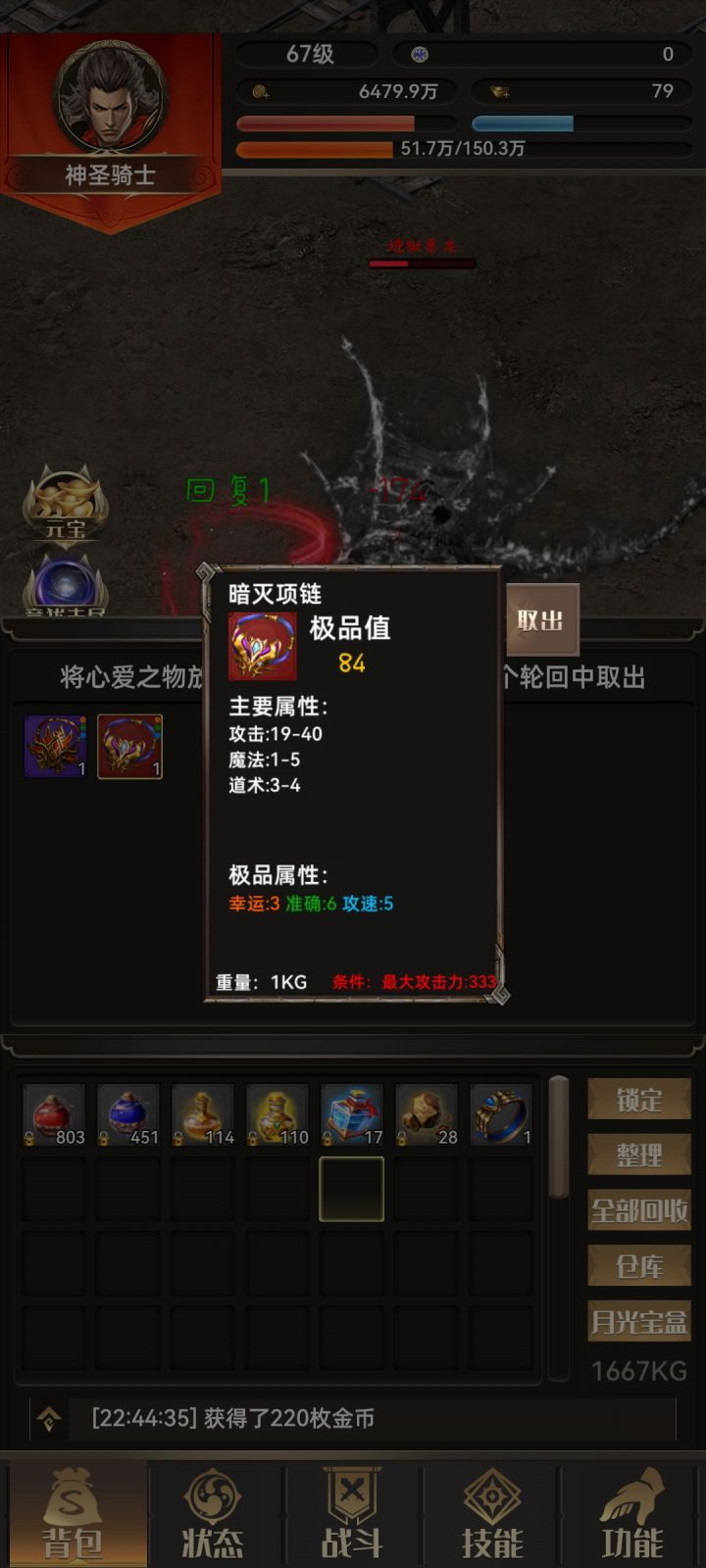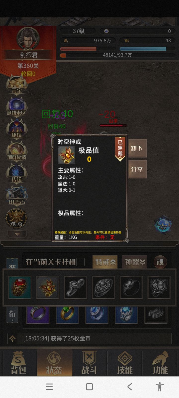 #一把刀无限版 首先要感谢木剑布衣大神的攻略。之前没怎么看攻略,瞎玩,想着反正单机慢慢瞎玩吧,后面感觉玩不下去,删了两次号。第二次删号是因为看了木剑布衣的攻略,感觉有道理,但是由于自己比较懒,到1480极品率才22。按照攻略,我应该把图三运3速5的项链就给法师,但是直到1480直接给我爆了红色的战士运3速5的项链(图四),很惊喜又感觉有点无助,我该怎么办是按照攻略二轮回开始无脑法师还是???