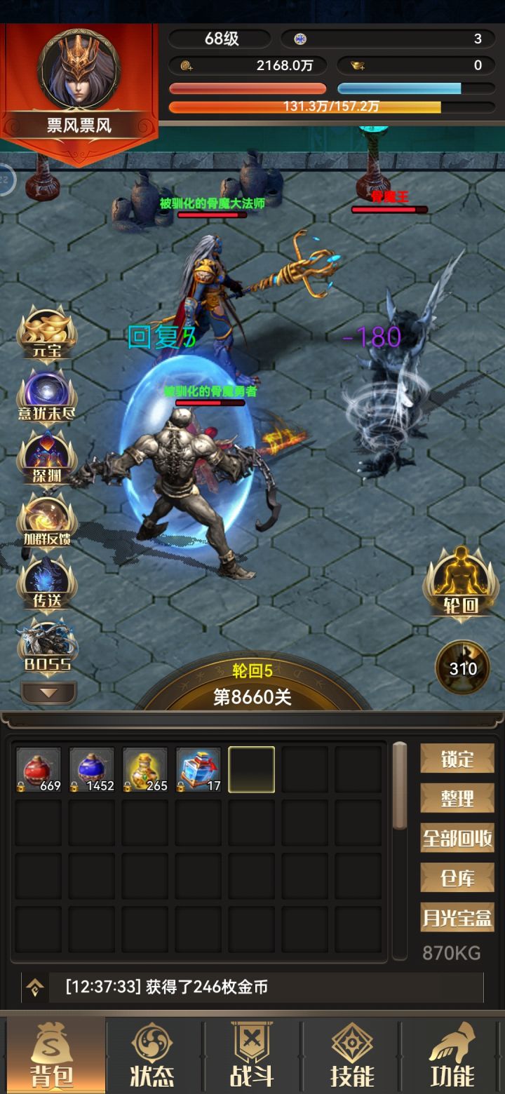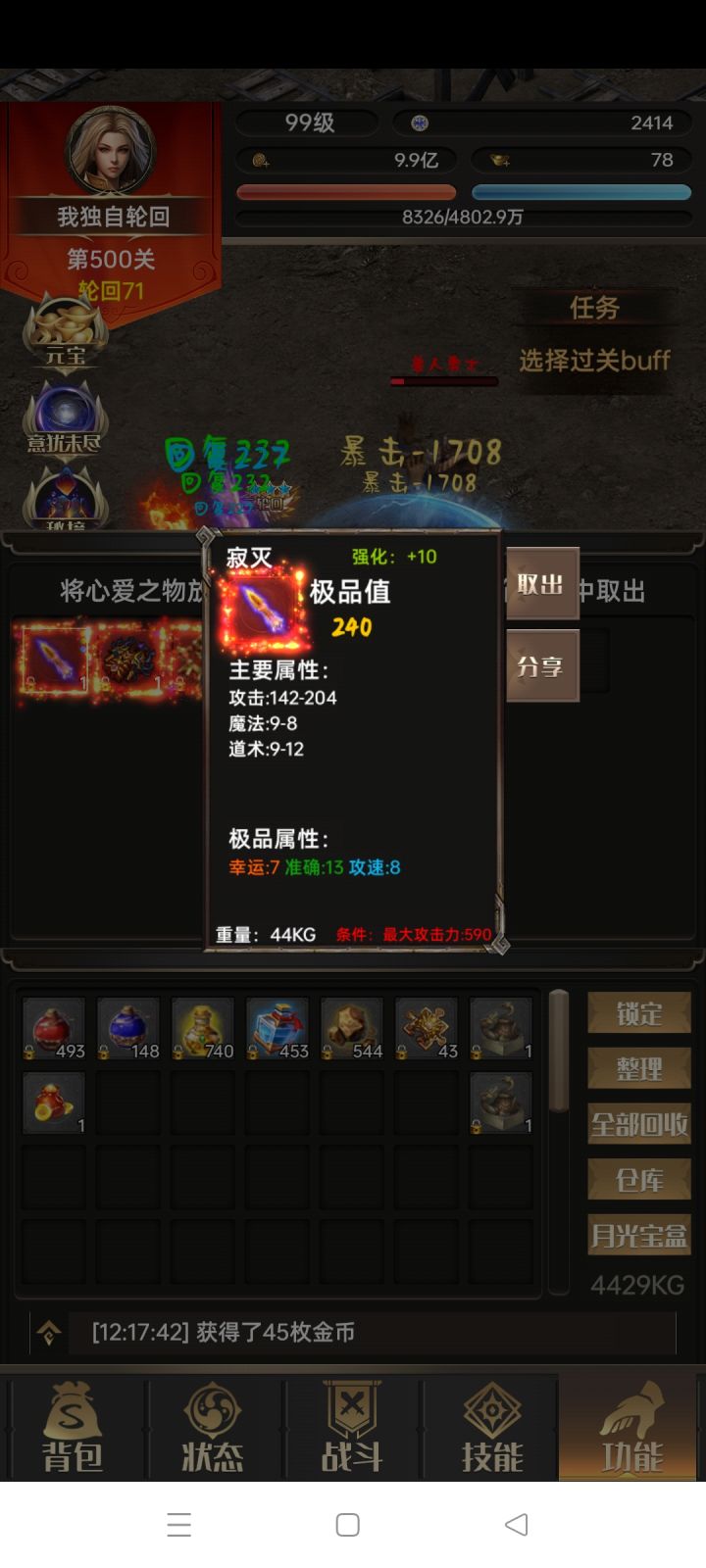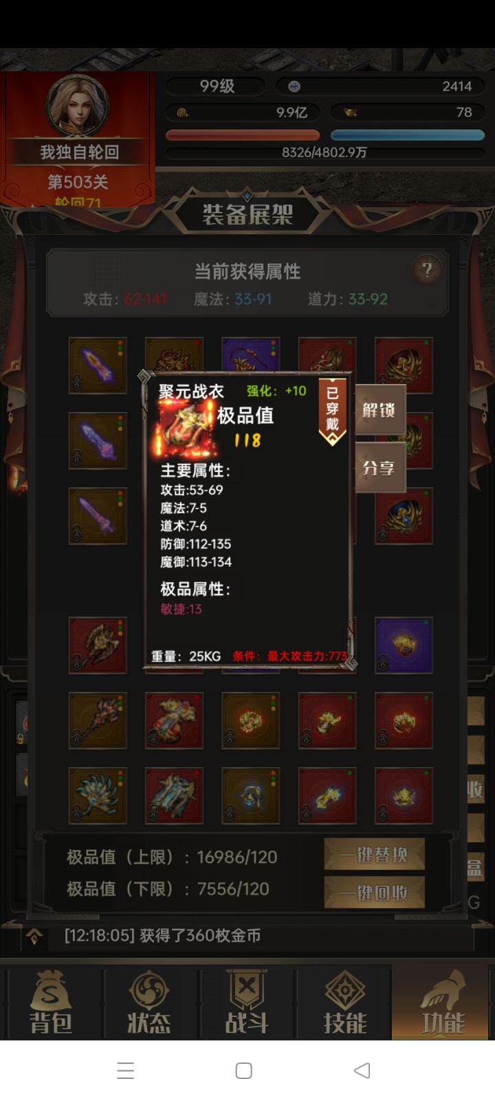 #一把刀无限版 首先要感谢木剑布衣大神的攻略。之前没怎么看攻略,瞎玩,想着反正单机慢慢瞎玩吧,后面感觉玩不下去,删了两次号。第二次删号是因为看了木剑布衣的攻略,感觉有道理,但是由于自己比较懒,到1480极品率才22。按照攻略,我应该把图三运3速5的项链就给法师,但是直到1480直接给我爆了红色的战士运3速5的项链(图四),很惊喜又感觉有点无助,我该怎么办是按照攻略二轮回开始无脑法师还是???