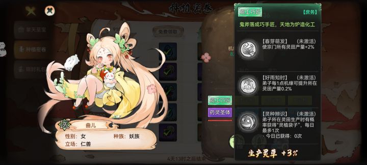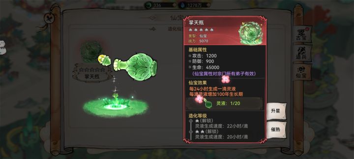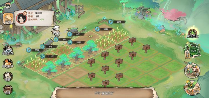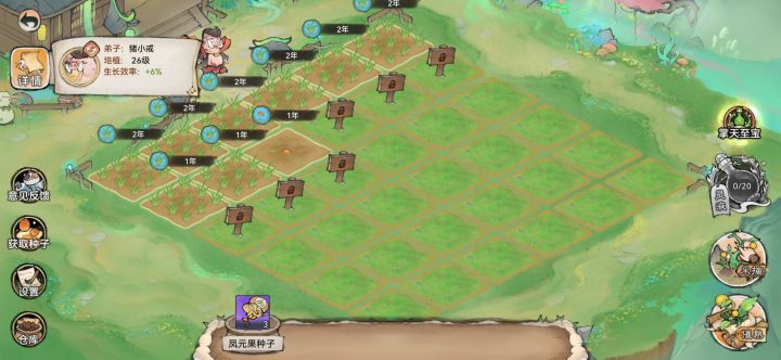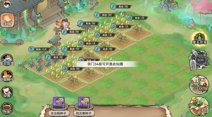 唯一好的就是送个加属性的法宝。其他都是一坨。生长周期长。奖励少。部分灵植来源不知道。比如加潜力那个灵植不知道怎么获取。我不知道出这个玩法的意义是什么。挺让人反感的。不知道你们官方能不能看见。如果灵植那个潜力灵植用仙栈或者仙盟再或者斗法台的积分兑换一周一个种子。一周一熟也有盼头。#一方灵田