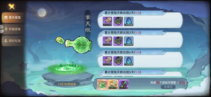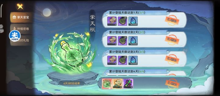 #一方灵田 种花家人最爱干的是什么,没错就是种田那么在最强祖师一方灵田玩法中最重要的的就是法宝掌天瓶了掌天瓶掌天瓶最高星的效率 8h/1滴 比起零星 24h/1滴 要高了三倍掌天瓶零星可以免费获取,最快三天速提(不买到1000玉礼包种子方面天云稻和凤云果比较鸡肋黄庭珀(po)和赤心参和九幽葵不建议种植 原因是新手获取难度高,收效微,不是很有用建议拿完任务奖励直接种天宝树(种子仙栈
