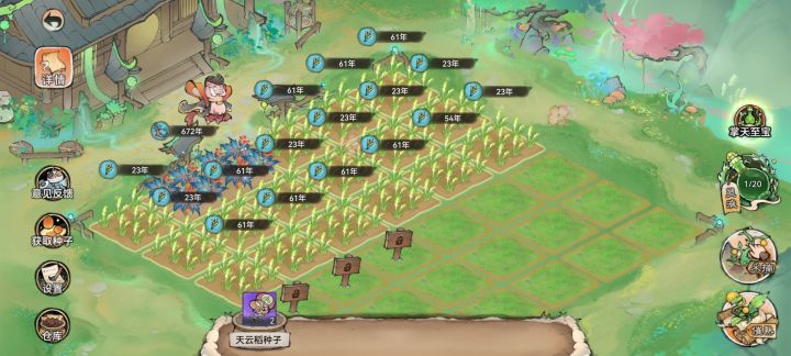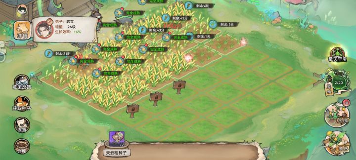 #一方灵田 从朋友推荐玩最强祖师到现在,玩了几波新区了。在抖音主播和老玩家的指点下,现在这个区终于玩的像那么回事了。最强祖师在坚守自己独特玩法的同时,兼容并包了很多已经成熟的玩法,一方灵田就是其中之一。新开发的一方灵田,配合新联动弟子韩立,真是绝佳组合,给祖师们带来不一样的游戏体验。 这几天我种植了天云稻等灵植,收获了各种果实、灵草,可以作为丹药来使用,有的也可以做炼丹材料。生长周期长的灵植