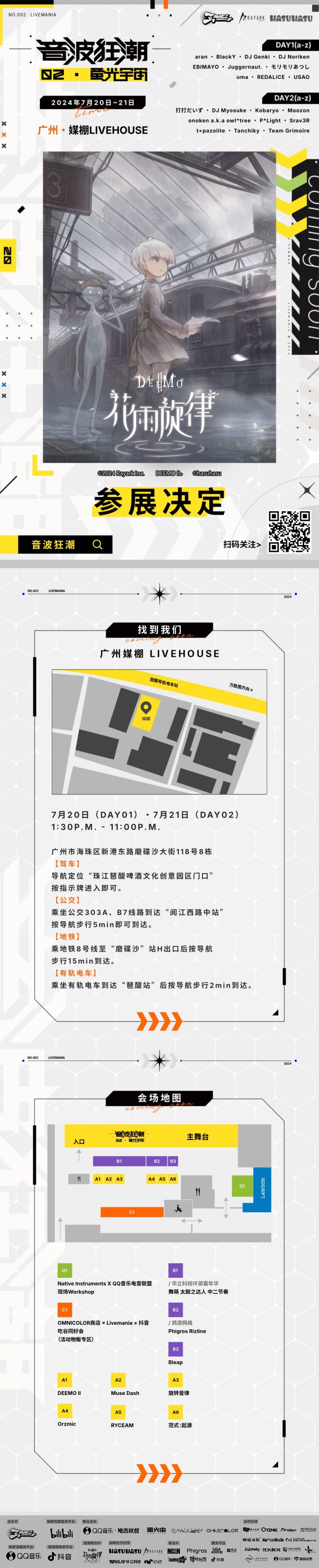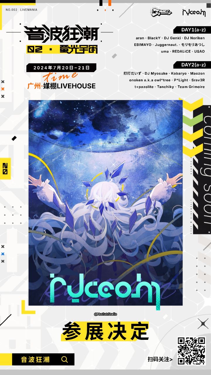 音波狂潮II荧光宇宙 音游嘉年华 参展确认!展位活动包括无料放送、周边场贩、前瞻试玩7.20~7.21,我们在活动区B5摊位,期待与广州的观测者们见面~场地信息:广州媒棚LIVE广州市海珠区新港东路磨碟沙大街118号8购票链接: https://show.bilibili.com/platform/detail.html?id=86632或前往 秀动/DY 搜索音波狂潮#ryceam#一起来看音波狂潮嘉年华